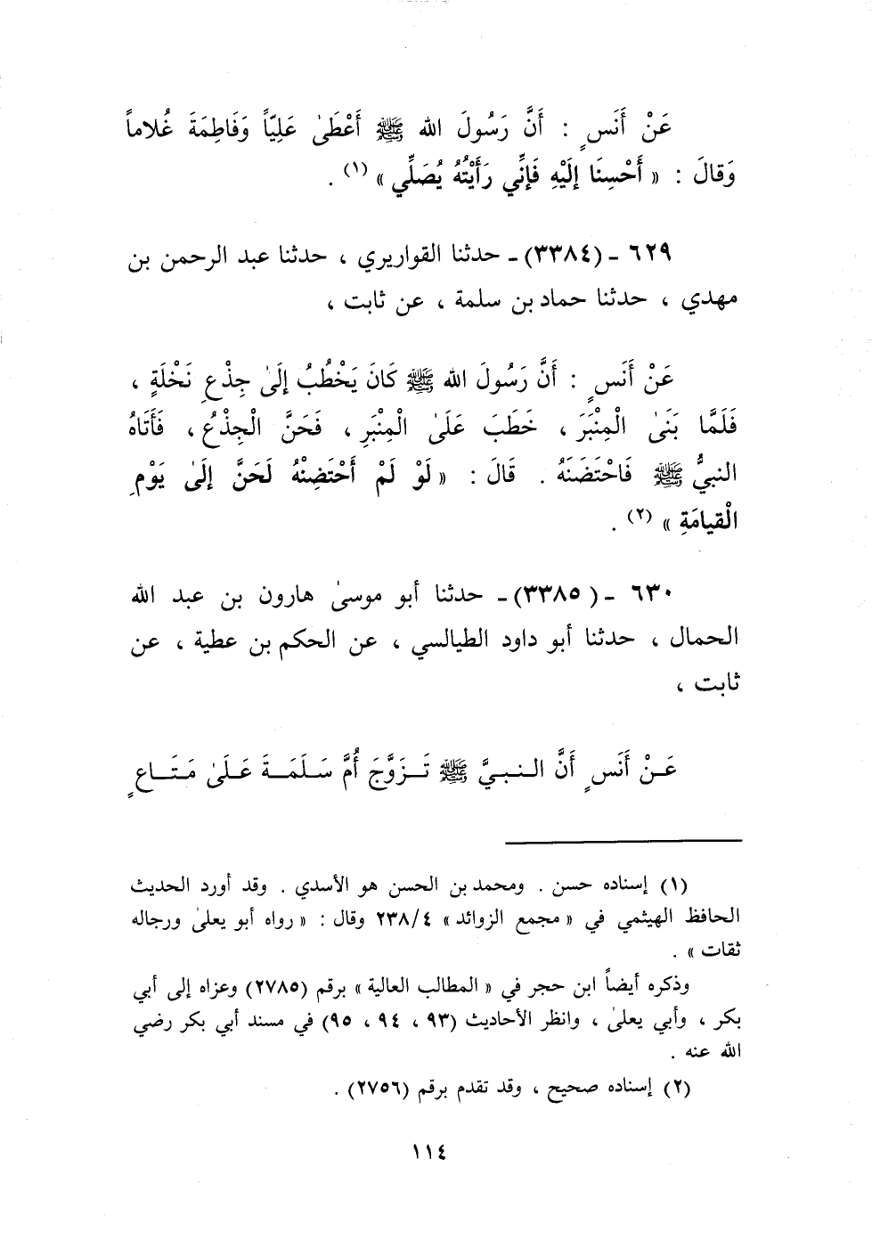 3384 - حَدَّثَنَا الْقَوَارِيرِيُّ، حَدَّثَنَا عَبْدُ الرَّحْمَنِ بْنُ مَهْدِيٍّ، حَدَّثَنَا حَمَّادُ بْنُ سَلَمَةَ، عَنْ ثَابِتٍ، عَنْ أَنَسٍ، أَنَّ رَسُولَ اللَّهِ صَلَّى اللهُ عَلَيْهِ وَسَلَّمَ كَانَ يَخْطُبُ إِلَى جِذْعِ نَخْلَةٍ، فَلَمَّا بَنَى الْمِنْبَرَ، خَطَبَ عَلَى الْمِنْبَرِ، فَحَنَّ الْجِذْعُ، فَأَتَاهُ النَّبِيُّ صَلَّى اللهُ عَلَيْهِ وَسَلَّمَ فَاحْتَضَنَهُ قَالَ: «§لَوْ لَمْ أَحْتَضِنْهُ لَحَنَّ إِلَى يَوْمِ الْقِيَامَةِ» Kإسناده صحيح