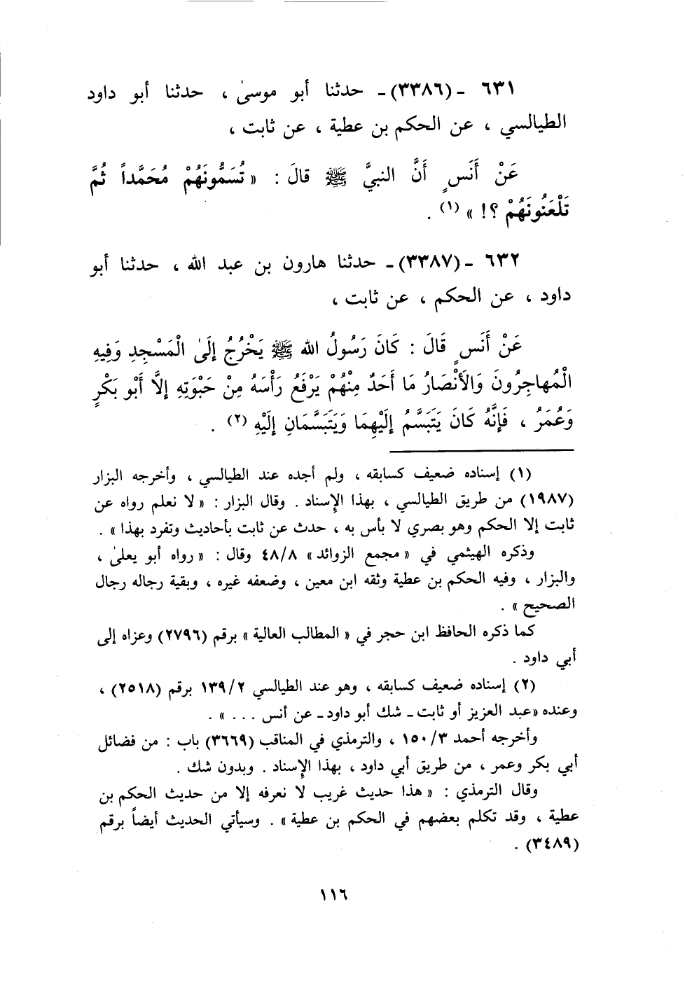 3386 - حَدَّثَنَا أَبُو مُوسَى، حَدَّثَنَا أَبُو دَاوُدَ الطَّيَالِيسِيُّ، عَنِ الْحَكَمِ بْنِ عَطِيَّةَ، عَنْ ثَابِتٍ، عَنْ أَنَسٍ، أَنَّ النَّبِيَّ صَلَّى اللهُ عَلَيْهِ وَسَلَّمَ قَالَ: «§تُسَمُّونَهُمْ مُحَمَّدًا ثُمَّ تَلْعَنُونَهُمْ؟» Kإسناده ضعيف