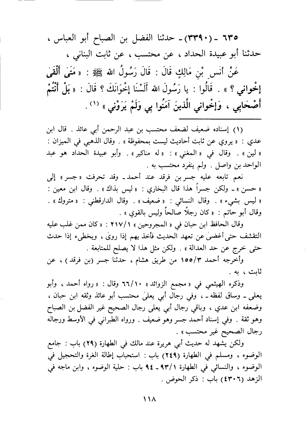3390 - حَدَّثَنَا الْفَضْلُ بْنُ الصَّبَّاحِ أَبُو الْعَبَّاسِ، حَدَّثَنَا أَبُو عُبَيْدَةَ الْحَدَّادُ، عَنْ مُحْتَسِبٌ، عَنْ ثَابِتٍ الْبُنَانِيِّ، عَنْ أَنَسِ بْنِ مَالِكٍ، قَالَ: قَالَ رَسُولُ اللَّهِ صَلَّى اللهُ عَلَيْهِ وَسَلَّمَ: «§مَتَى أَلْقَى إِخْوَانِي؟» قَالُوا: يَا رَسُولَ اللَّهِ، أَلَسْنَا إِخْوَانَكَ؟ قَالَ: «بَلْ أَنْتُمْ أَصْحَابِي، وَإِخْوَانِي الَّذِينَ آمَنُوا بِي وَلَمْ يَرَوْنِي» Kإسناده ضعيف