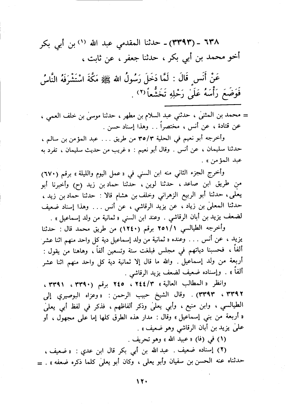 3393 - حَدَّثَنَا الْمُقَدَّمِيُّ عَبْدُ اللَّهِ بْنُ أَبِي بَكْرٍ، أَخُو مُحَمَّدِ بْنِ أَبِي بَكْرٍ، حَدَّثَنَا جَعْفَرٌ، عَنْ ثَابِتٍ، عَنْ أَنَسٍ، قَالَ: «§لَمَّا دَخَلَ رَسُولُ اللَّهِ صَلَّى اللهُ عَلَيْهِ وَسَلَّمَ مَكَّةَ اسْتَشْرَفَهُ النَّاسُ، فَوَضَعَ رَأْسَهُ عَلَى رَحْلِهِ تَخَشُّعًا» Kإسناده ضعيف