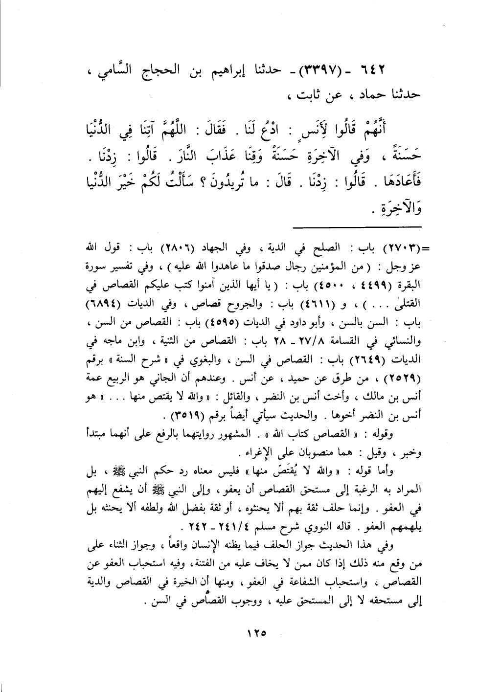 3397 - حَدَّثَنَا إِبْرَاهِيمُ بْنُ الْحَجَّاجِ السَّامِيُّ، حَدَّثَنَا حَمَّادٌ، عَنْ ثَابِتٍ، أَنَّهُمْ قَالُوا لِأَنَسٍ: ادْعُ لَنَا، فَقَالَ: §اللَّهُمَّ آتِنَا فِي الدُّنْيَا حَسَنَةً، وَفِي الْآخِرَةِ حَسَنَةً وَقِنَا عَذَابَ النَّارِ، قَالُوا: زِدْنَا، فَأَعَادَهَا، قَالُوا: زِدْنَا، قَالَ: مَا تُرِيدُونَ؟ سَأَلْتُ لَكُمْ خَيْرَ الدُّنْيَا وَالْآخِرَةِ، قَالَ أَنَسٌ: فَكَانَ رَسُولُ اللَّهِ صَلَّى اللهُ عَلَيْهِ وَسَلَّمَ يُكْثِرُ أَنْ يَدْعُوَ: «اللَّهُمَّ آتِنَا فِي الدُّنْيَا حَسَنَةً، وَفِي الْآخِرَةِ حَسَنَةً وَقِنَا عَذَابَ النَّارِ» Kإسناده صحيح