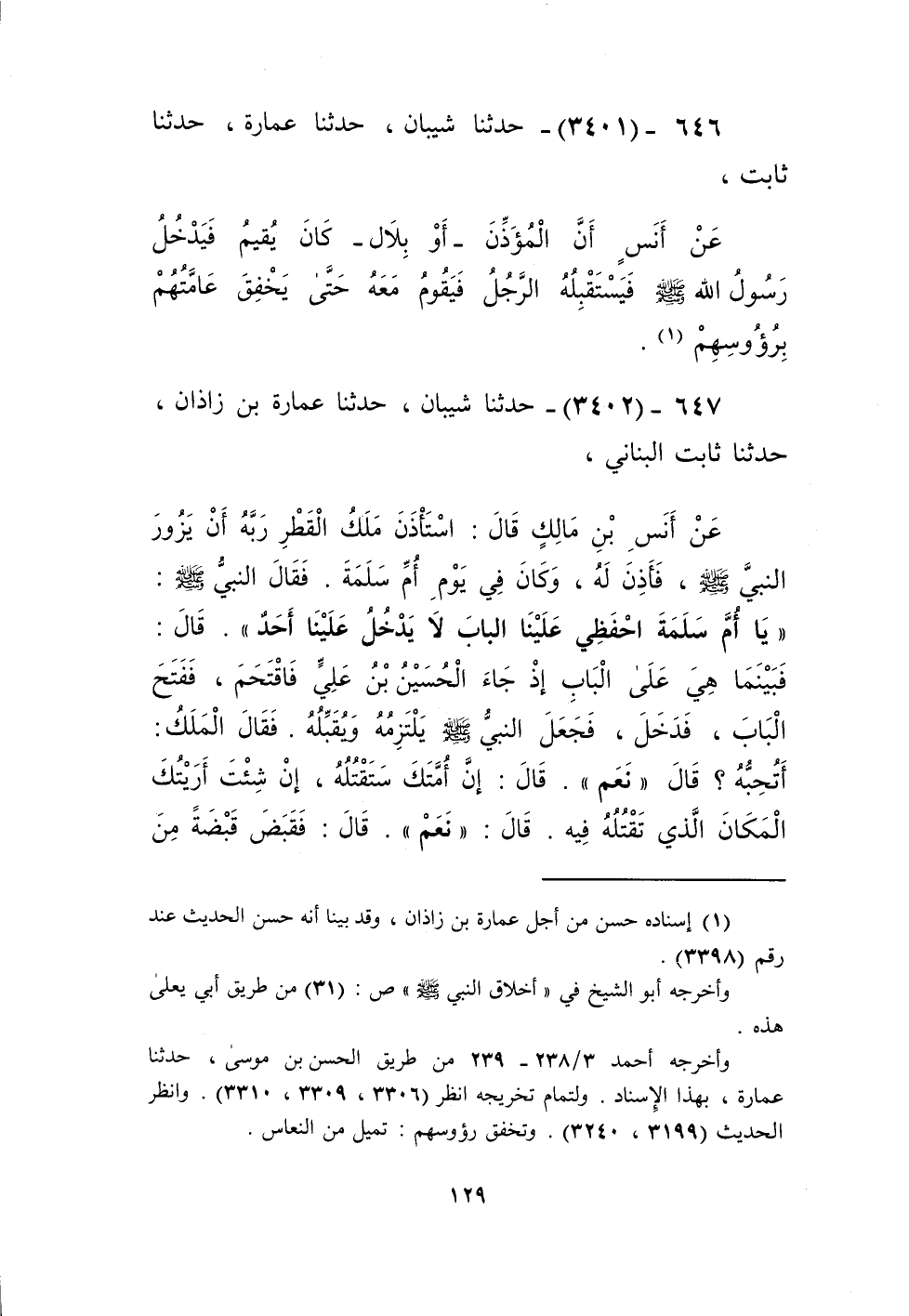 3402 - حَدَّثَنَا شَيْبَانُ، حَدَّثَنَا عُمَارَةُ بْنُ زَاذَانَ، حَدَّثَنَا ثَابِتٌ الْبُنَانِيُّ، عَنْ أَنَسِ بْنِ مَالِكٍ، قَالَ: اسْتَأْذَنَ مَلَكُ الْقَطْرِ رَبَّهُ أَنْ يَزُورَ النَّبِيَّ صَلَّى اللهُ عَلَيْهِ وَسَلَّمَ، فَأَذِنَ لَهُ، وَكَانَ فِي يَوْمِ أُمِّ سَلَمَةَ، فَقَالَ النَّبِيُّ صَلَّى اللهُ عَلَيْهِ وَسَلَّمَ: «يَا أُمَّ سَلَمَةَ، §احْفَظِي عَلَيْنَا الْبَابَ لَا يَدْخُلْ عَلَيْنَا أَحَدٌ» قَالَ: فَبَيْنَمَا هِيَ عَلَى الْبَابِ إِذْ جَاءَ الْحُسَيْنُ بْنُ عَلِيٍّ، فَاقْتَحَمَ، فَفَتَحَ الْبَابَ، فَدَخَلَ، فَجَعَلَ النَّبِيُّ صَلَّى اللهُ عَلَيْهِ وَسَلَّمَ يَلْتَزِمُهُ وَيُقَبِّلُهُ، فَقَالَ الْمَلَكُ: أَتُحِبُّهُ؟ قَالَ: «نَعَمْ». قَالَ: إِنَّ أُمَّتَكَ سَتَقْتُلُهُ، إِنْ شِئْتَ أَرَيْتُكَ الْمَكَانَ الَّذِي تَقْتُلُهُ فِيهِ. قَالَ: «نَعَمْ». قَالَ: فَقَبَضَ قَبْضَةً مِنَ الْمَكَانِ الَّذِي قُتِلَ بِهِ، فَأَرَاهُ فَجَاءَ سَهْلَةٌ - أَوْ تُرَابٌ أَحْمَرُ - فَأَخَذَتْهُ أُمُّ سَلَمَةَ فَجَعَلْتُهُ فِي ثَوْبِهَا، قَالَ ثَابِتٌ: فَكُنَّا نَقُولُ: إِنَّهَا كَرْبَلَاءُKإسناده حسن