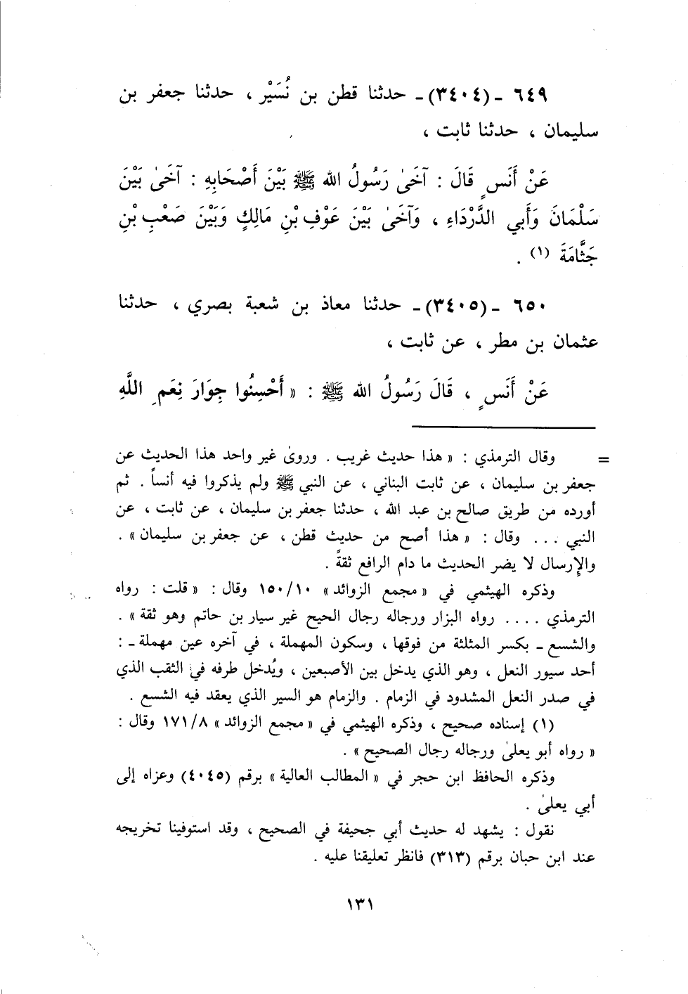 3404 - حَدَّثَنَا قَطَنُ بْنُ نُسَيْرٍ، حَدَّثَنَا جَعْفَرُ بْنُ سُلَيْمَانَ، حَدَّثَنَا ثَابِتٌ، عَنْ أَنَسٍ، قَالَ: «§آخَى رَسُولُ اللَّهِ صَلَّى اللهُ عَلَيْهِ وَسَلَّمَ بَيْنَ أَصْحَابِهِ، آخَى بَيْنَ سَلْمَانَ وَأَبِي الدَّرْدَاءِ، وَآخَى بَيْنَ عَوْفِ بْنِ مَالِكٍ وَبَيْنَ صَعْبِ بْنِ جَثَّامَةَ» Kإسناده صحيح