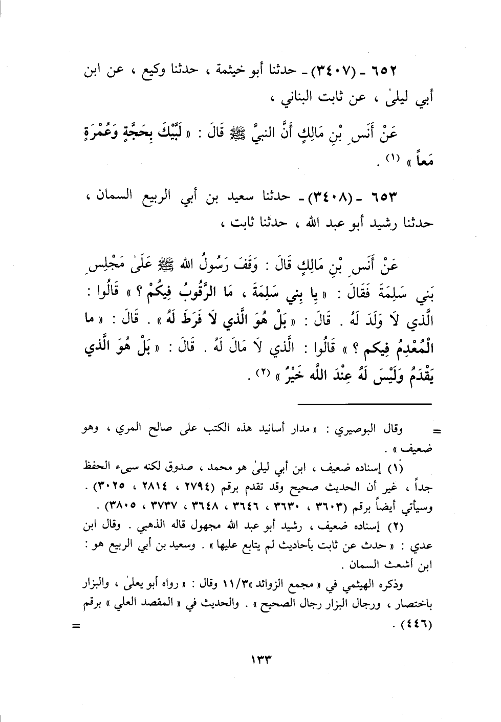 3408 - حَدَّثَنَا سَعِيدُ بْنُ أَبِي الرَّبِيعِ السَّمَّانُ، حَدَّثَنَا رُشَيْدٌ أَبُو عَبْدِ اللَّهِ، حَدَّثَنَا ثَابِتٌ، عَنْ أَنَسِ بْنِ مَالِكٍ، قَالَ: وَقَفَ رَسُولُ اللَّهِ صَلَّى اللهُ عَلَيْهِ وَسَلَّمَ عَلَى مَجْلِسِ بَنِي سَلِمَةَ فَقَالَ: «§يَا بَنِي سَلِمَةَ، مَا الرَّقُوبُ فِيكُمْ؟» قَالُوا: الَّذِي لَا وَلَدَ لَهُ. قَالَ: «بَلْ هُوَ الَّذِي لَا فَرَطَ لَهُ». قَالَ: «مَا الْمُعْدِمُ فِيكُمْ؟». قَالُوا: الَّذِي لَا مَالَ لَهُ. قَالَ: «بَلْ هُوَ الَّذِي يَقْدَمُ وَلَيْسَ لَهُ عِنْدَ اللَّهِ خَيْرٌ» Kإسناده ضعيف