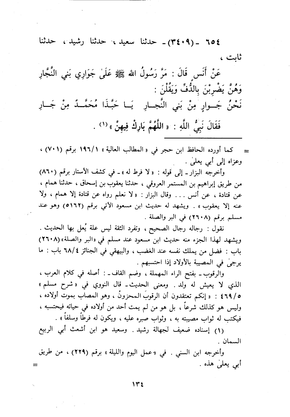 3409 - حَدَّثَنَا سَعِيدُ، حَدَّثَنَا رُشَيْدٌ،، حَدَّثَنَا ثَابِتٌ، عَنْ أَنَسٍ، قَالَ: مَرَّ رَسُولُ اللَّهِ صَلَّى اللهُ عَلَيْهِ وَسَلَّمَ عَلَى جَوَارِي بَنِي النَّجَّارِ وَهُنَّ يَضْرِبْنَ بِالدُّفِّ، وَيَقُلْنَ:
