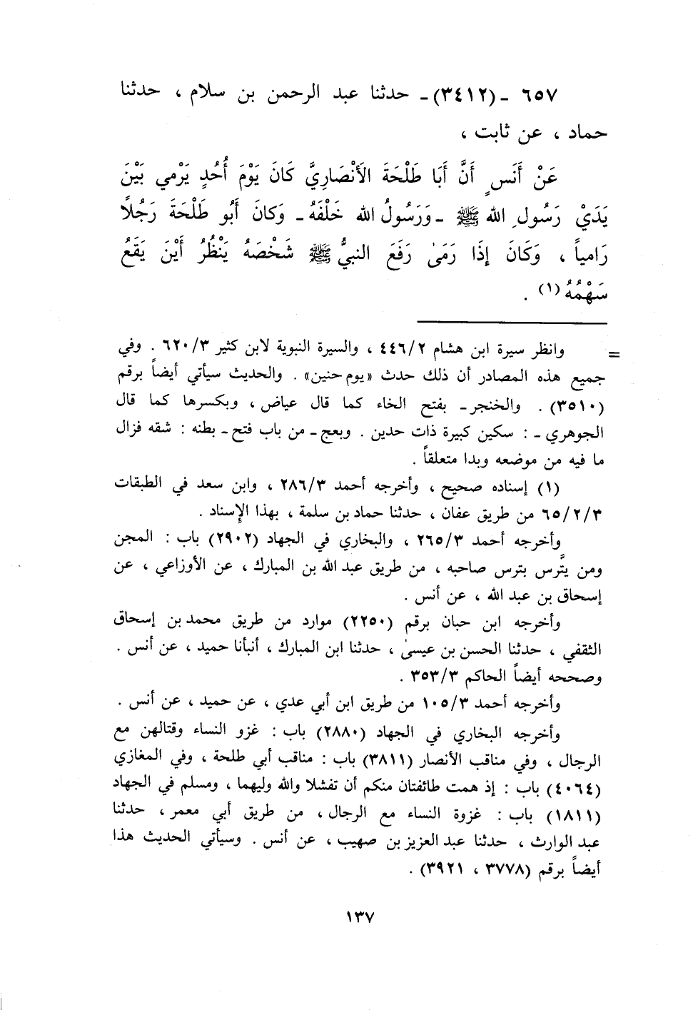 3412 - حَدَّثَنَا عَبْدُ الرَّحْمَنِ بْنُ سَلَّامٍ، حَدَّثَنَا حَمَّادٌ، عَنْ ثَابِتٍ، عَنْ أَنَسٍ، أَنَّ أَبَا طَلْحَةَ الْأَنْصَارِيَّ، كَانَ يَوْمَ أُحُدٍ يَرْمِي بَيْنَ يَدَيْ رَسُولِ اللَّهِ صَلَّى اللهُ عَلَيْهِ وَسَلَّمَ، وَرَسُولُ اللَّهِ خَلْفَهُ، وَكَانَ أَبُو طَلْحَةَ رَجُلًا رَامِيًا، وَكَانَ «§إِذَا رَمَى رَفَعَ النَّبِيُّ صَلَّى اللهُ عَلَيْهِ وَسَلَّمَ شَخْصَهُ يَنْظُرُ أَيْنَ يَقَعُ سَهْمُهُ» Kإسناده صحيح