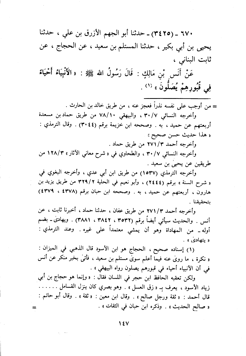 3425 - حَدَّثَنَا أَبُو الْجَهْمِ الْأَزْرَقُ بْنُ عَلِيٍّ، حَدَّثَنَا يَحْيَى بْنُ أَبِي بُكَيْرٍ، حَدَّثَنَا الْمُسْتَلِمُ بْنُ سَعِيدٍ، عَنِ الْحَجَّاجِ، عَنْ ثَابِتٍ الْبُنَانِيِّ، عَنْ أَنَسِ بْنِ مَالِكٍ، قَالَ رَسُولُ اللَّهِ صَلَّى اللهُ عَلَيْهِ وَسَلَّمَ: «§الْأَنْبِيَاءُ أَحْيَاءٌ فِي قُبُورِهِمْ يُصَلُّونَ» Kإسناده صحيح