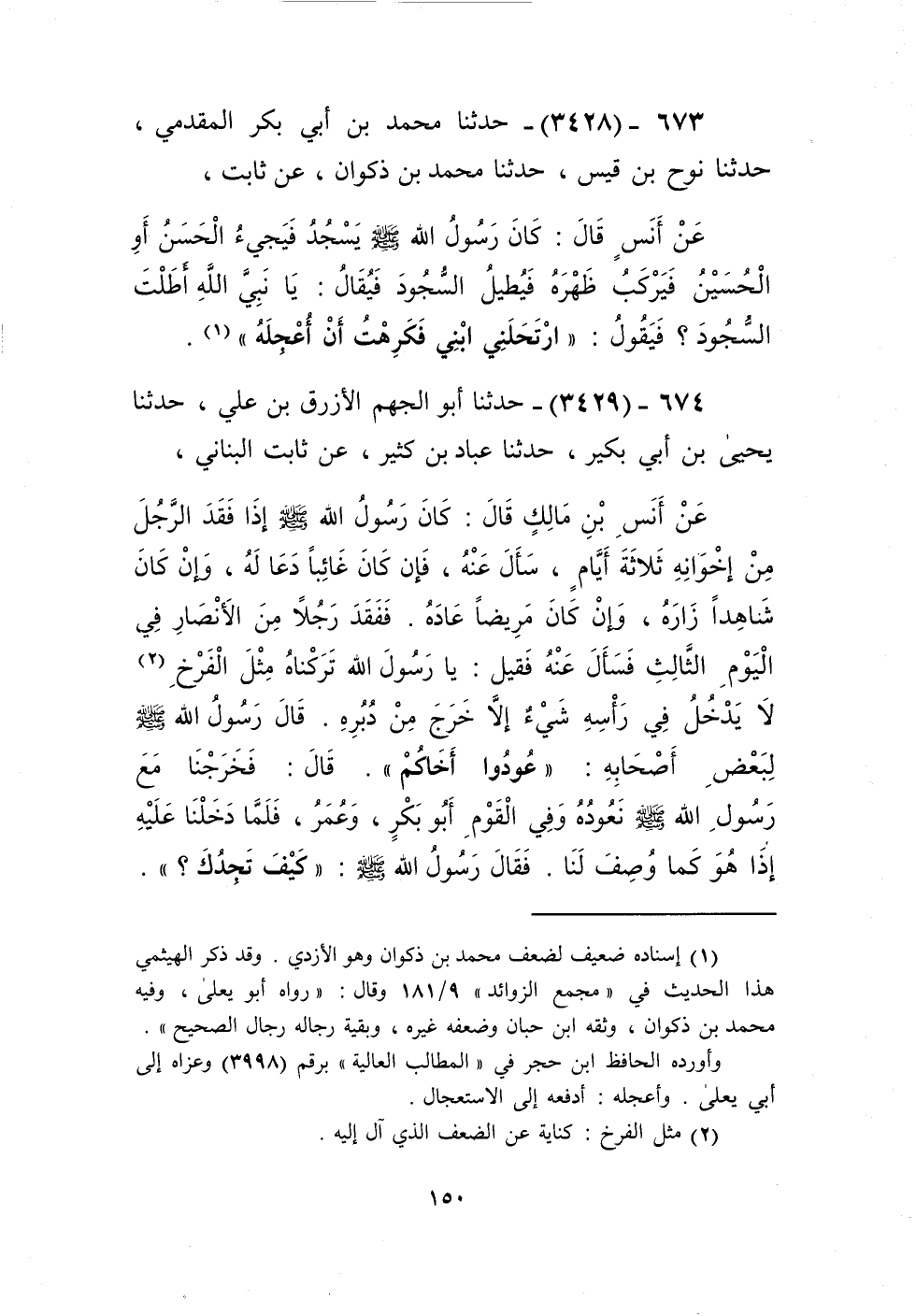 3428 - حَدَّثَنَا مُحَمَّدُ بْنُ أَبِي بَكْرٍ الْمُقَدَّمِيُّ، حَدَّثَنَا نُوحُ بْنُ قَيْسٍ، حَدَّثَنَا مُحَمَّدُ بْنُ ذَكْوَانَ، عَنْ ثَابِتٍ، عَنْ أَنَسٍ، قَالَ: كَانَ رَسُولُ اللَّهِ صَلَّى اللهُ عَلَيْهِ وَسَلَّمَ يَسْجُدُ فَيَجِيءُ الْحَسَنُ أَوِ الْحُسَيْنُ فَيَرْكَبُ عَلَى ظَهْرِهِ، فَيُطِيلُ السُّجُودَ فَيُقَالُ: يَا نَبِيَّ اللَّهِ، أَطَلْتَ السُّجُودَ؟ فَيَقُولُ: «§ارْتَحَلَنِي ابْنِي فَكَرِهْتُ أَنْ أُعْجِلَهُ» Kإسناده ضعيف