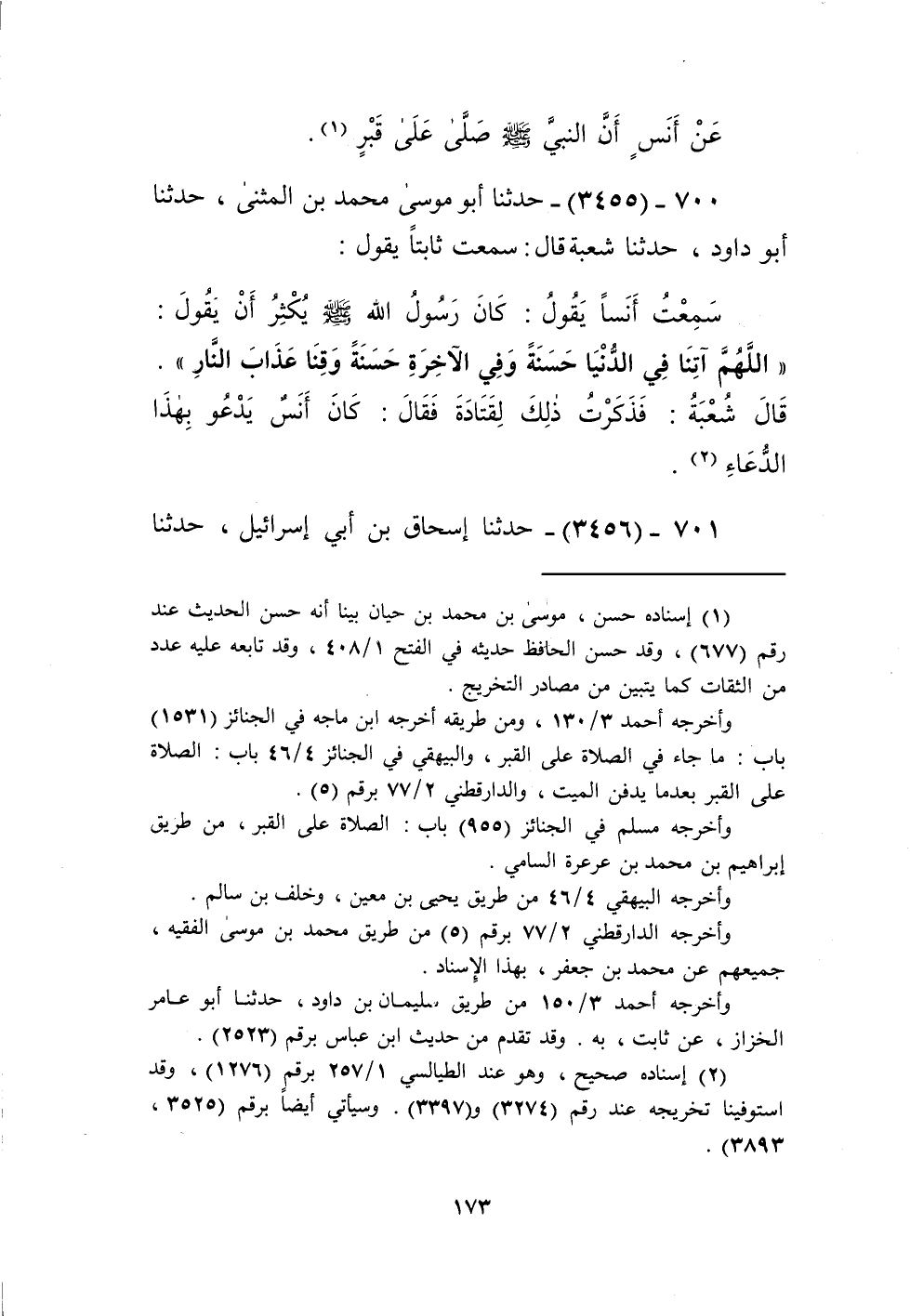 3455 - حَدَّثَنَا أَبُو مُوسَى مُحَمَّدُ بْنُ الْمُثَنَّى، حَدَّثَنَا أَبُو دَاوُدَ، حَدَّثَنَا شُعْبَةُ، قَالَ: سَمِعْتُ ثَابِتًا، يَقُولُ: سَمِعْتُ أَنَسًا، يَقُولُ: كَانَ رَسُولُ اللَّهِ صَلَّى اللهُ عَلَيْهِ وَسَلَّمَ يُكْثِرُ أَنْ يَقُولَ: «§اللَّهُمَّ آتِنَا فِي الدُّنْيَا حَسَنَةً وَفِي الْآخِرَةِ حَسَنَةً وَقِنَا عَذَابَ النَّارِ» قَالَ شُعْبَةُ: فَذَكَرْتُ ذَلِكَ لِقَتَادَةَ، فَقَالَ: «كَانَ أَنَسٌ، يَدْعُو بِهَذَا الدُّعَاءِ» Kإسناده صحيح