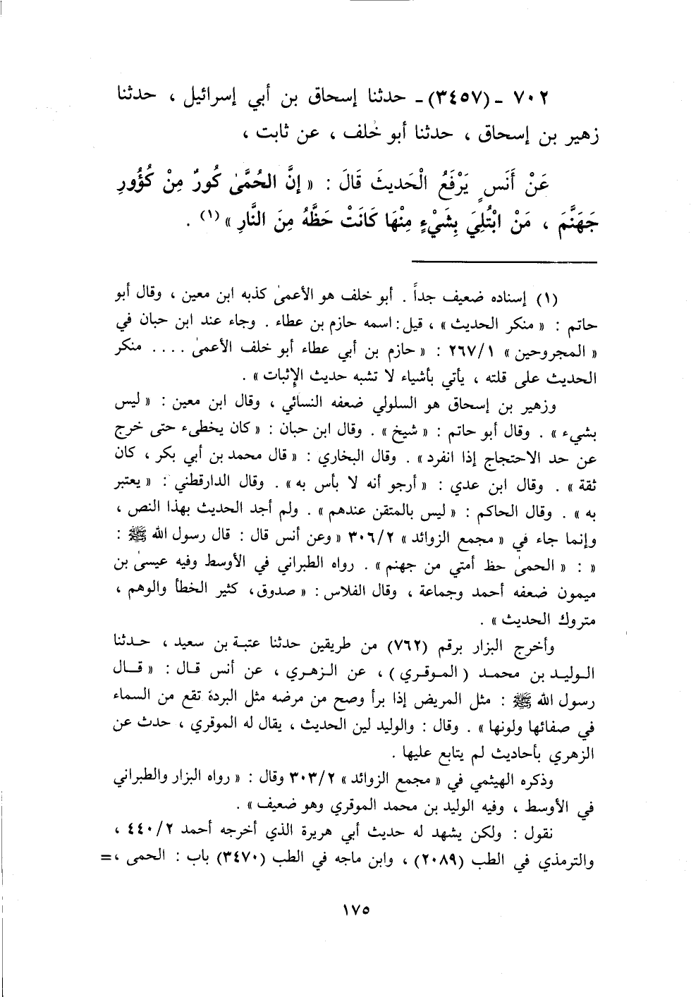 3457 - حَدَّثَنَا إِسْحَاقُ بْنُ أَبِي إِسْرَائِيلَ، حَدَّثَنَا زُهَيْرُ بْنُ إِسْحَاقَ، حَدَّثَنَا أَبُو خَلَفٍ، عَنْ ثَابِتٍ، عَنْ أَنَسٍ، يَرْفَعُ الْحَدِيثَ قَالَ: «§إِنَّ الْحُمَّى كُورٌ مِنْ كُئُورِ جَهَنَّمَ، مَنِ ابْتُلِيَ بِشَيْءٍ مِنْهَا كَانَتْ حظَّهُ مِنَ النَّارِ» Kإسناده ضعيف جدا