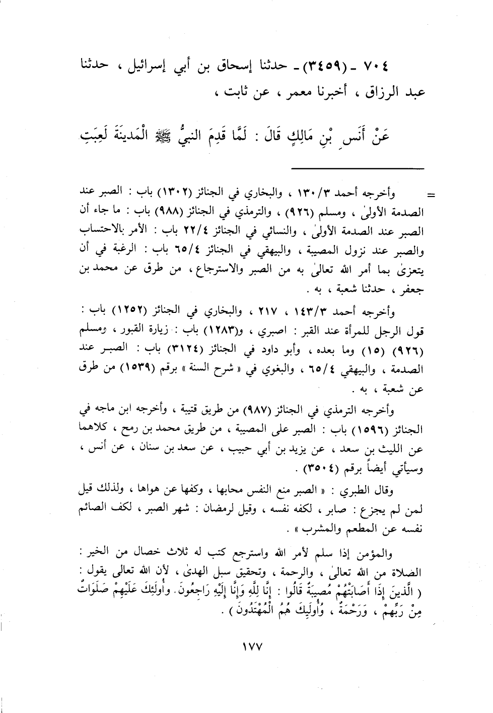 3459 - حَدَّثَنَا إِسْحَاقُ بْنُ أَبِي إِسْرَائِيلَ، حَدَّثَنَا عَبْدُ الرَّزَّاقِ، أَخْبَرَنَا مَعْمَرٌ، عَنْ ثَابِتٍ، عَنْ أَنَسِ بْنِ مَالِكٍ، قَالَ: «§لَمَّا قَدِمَ النَّبِيُّ صَلَّى اللهُ عَلَيْهِ وَسَلَّمَ الْمَدِينَةَ لَعِبَتِ الْحَبَشَةُ بِحِرَابِهِمْ فَرَحًا بِذَلِكَ» Kإسناده صحيح