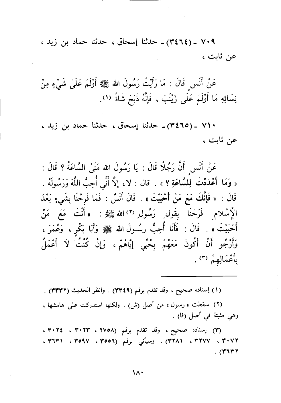 3465 - حَدَّثَنَا إِسْحَاقُ، حَدَّثَنَا حَمَّادُ بْنُ زَيْدٍ، عَنْ ثَابِتٍ، عَنْ أَنَسٍ، أَنَّ رَجُلًا قَالَ: يَا رَسُولَ اللَّهِ، §مَتَى السَّاعَةُ؟ قَالَ: «وَمَا أَعْدَدْتَ لِلسَّاعَةِ؟» قَالَ: لَا، إِلَّا أَنِّي أُحِبُّ اللَّهَ وَرَسُولَهُ. قَالَ: «فَإِنَّكَ مَعَ مَنْ أَحْبَبْتَ». قَالَ أَنَسٌ: فَمَا فَرِحْنَا بِشَيْءٍ بَعْدَ الْإِسْلَامِ فَرَحَنَا بِقَوْلِ رَسُولِ اللَّهِ صَلَّى اللهُ عَلَيْهِ وَسَلَّمَ: «أَنْتَ مَعَ مَنْ أَحْبَبْتَ». قَالَ: فَأَنَا أُحِبُّ رَسُولَ اللَّهِ صَلَّى اللهُ عَلَيْهِ وَسَلَّمَ وَأَبَا بَكْرٍ، وَعُمَرَ، وَأَرْجُو أَنْ أَكُونَ مَعَهُمْ بِحُبِّي إِيَّاهُمْ، وَإِنْ كُنْتُ لَا أَعْمَلُ بِأَعْمَالِهِمْKإسناده صحيح