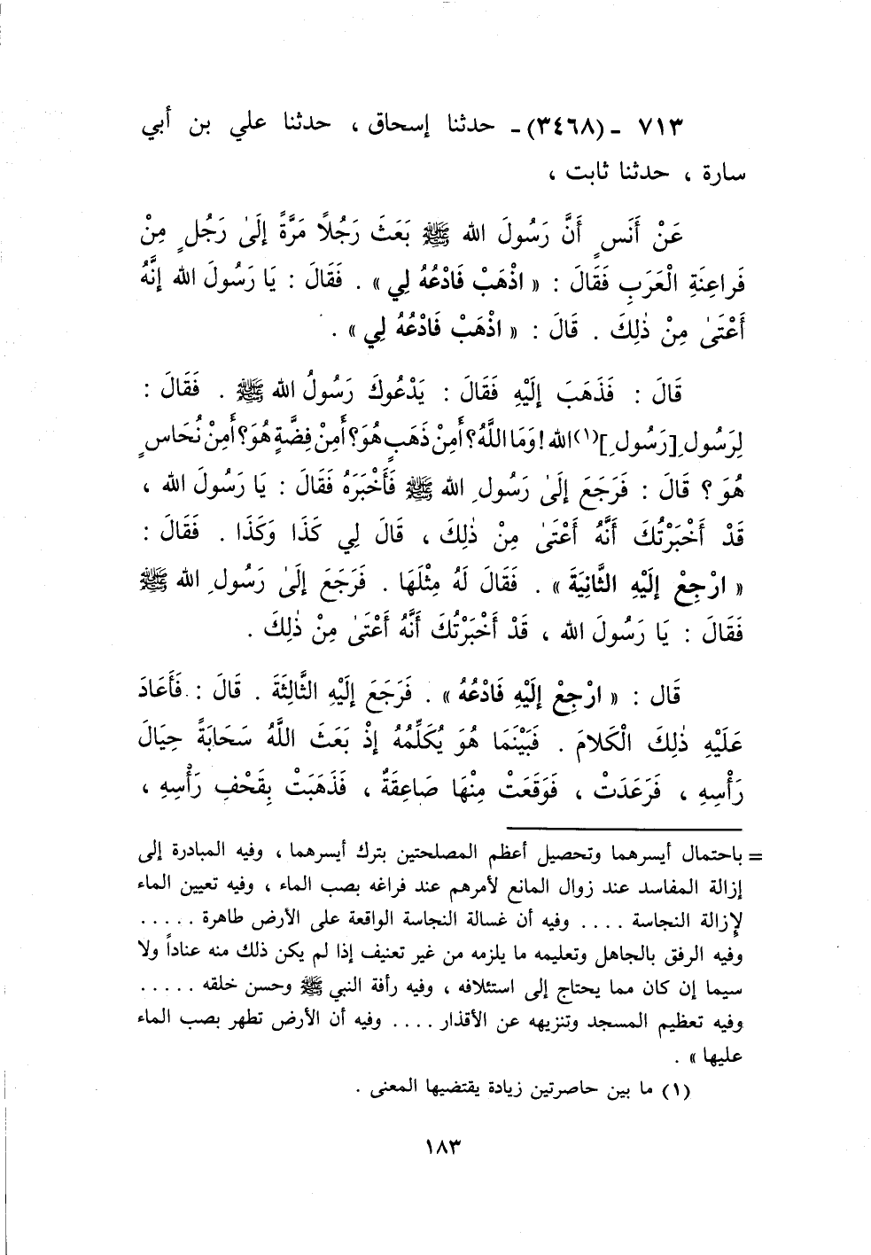 3468 - حَدَّثَنَا إِسْحَاقُ، حَدَّثَنَا عَلِيُّ بْنُ أَبِي سَارَةَ، حَدَّثَنَا ثَابِتٌ، عَنْ أَنَسٍ، أَنَّ رَسُولَ اللَّهِ صَلَّى اللهُ عَلَيْهِ وَسَلَّمَ بَعَثَ رَجُلًا مَرَّةً إِلَى رَجُلٍ مِنْ فَرَاعِنَةِ الْعَرَبِ فَقَالَ: «§اذْهَبْ فَادْعُهُ لِي». فَقَالَ: يَا رَسُولَ اللَّهِ، إِنَّهُ أَعْتَى مِنْ ذَلِكَ. قَالَ: «اذْهَبْ فَادْعُهُ لِي». قَالَ: فَذَهَبَ إِلَيْهِ فَقَالَ: يَدْعُوكَ رَسُولُ اللَّهِ صَلَّى اللهُ عَلَيْهِ وَسَلَّمَ. فَقَالَ لِرَسُولِ رَسُولِ اللَّهِ: وَمَا اللَّهُ؟ أَمِنْ ذَهَبٍ هُوَ؟ أَمِنْ فِضَّةٍ هُوَ؟ أَمِنْ نُحَاسٍ هُوَ؟ قَالَ: فَرَجَعَ إِلَى رَسُولِ اللَّهِ صَلَّى اللهُ عَلَيْهِ وَسَلَّمَ فَأَخْبَرَهُ، فَقَالَ: يَا رَسُولَ اللَّهِ، قَدْ أَخْبَرْتُكَ أَنَّهُ أَعْتَى مِنْ ذَلِكَ، قَالَ لِي كَذَا وَكَذَا. فَقَالَ: «ارْجِعْ إِلَيْهِ الثَّانِيَةَ». فَقَالَ لَهُ مِثْلَهَا، فَرَجَعَ إِلَى رَسُولِ اللَّهِ صَلَّى اللهُ عَلَيْهِ وَسَلَّمَ فَقَالَ: يَا رَسُولَ اللَّهِ، قَدْ أَخْبَرْتُكَ أَنَّهُ أَعْتَى مِنْ ذَلِكَ، قَالَ: «ارْجِعْ إِلَيْهِ فَادْعُهُ». فَرَجَعَ إِلَيْهِ الثَّالِثَةَ، قَالَ: فَأَعَادَ عَلَيْهِ ذَلِكَ الْكَلَامَ، فَبَيْنَمَا هُوَ يُكَلِّمُهُ إِذْ بَعَثَ اللَّهُ سَحَابَةً حِيَالَ رَأْسِهِ، فَرَعَدَتْ، فَوَقَعَتْ مِنْهَا صَاعِقَةٌ، فَذَهَبَتْ بِقَحْفِ رَأْسِهِ، فَأَنْزَلَ اللَّهُ: {وَيُرْسِلُ الصَّوَاعِقَ فَيُصِيبُ بِهَا مَنْ يَشَاءُ} [الرعد: 13] الْآيَةُKإسناده ضعيف