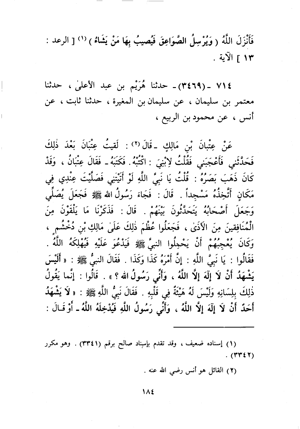 3469 - حَدَّثَنَا هُرَيْمُ بْنُ عَبْدِ الْأَعْلَى، حَدَّثَنَا مُعْتَمِرُ بْنُ سُلَيْمَانَ، عَنْ سُلَيْمَانَ بْنِ الْمُغِيرَةِ، حَدَّثَنَا ثَابِتٌ، عَنْ أَنَسٍ، عَنْ مَحْمُودِ بْنِ الرَّبِيعِ، عَنْ عِتْبَانَ بْنِ مَالِكٍ - قَالَ: لَقِيتُ عِتْبَانَ بَعْدَ ذَلِكَ فَحَدَّثَنِي فَأَعْجَبَنِي فَقُلْتُ لِابْنِي: اكْتُبْهُ. فَكَتَبَهُ - فَقَالَ عِتْبَانُ، وَقَدْ كَانَ ذَهَبَ بَصَرَهُ قُلْتُ: يَا نَبِيَّ اللَّهِ لَوْ أَتَيْتَنِي فَصَلَّيْتَ عِنْدِي فِي مَكَانٍ أَتَّخِذُهُ مَسْجِدًا. قَالَ: فَجَاءَ رَسُولُ اللَّهِ صَلَّى اللهُ عَلَيْهِ وَسَلَّمَ فَجَعَلَ يُصَلِّي وَجَعَلَ أَصْحَابَهُ يَتَحَدَّثُونَ بَيْنَهُمْ، قَالَ: فَذَكَرْنَا مَا يَلْقَوْنَ مِنَ الْمُنَافِقِينَ مِنَ الْأَذَى، فَجَعَلُوا عُظْمَ ذَلِكَ عَلَى مَالِكِ بْنِ دُخْشُمٍ وَكَانَ يُعْجِبُهُمْ أَنْ يَحْمِلُوا النَّبِيُّ صَلَّى اللهُ عَلَيْهِ وَسَلَّمَ فَيَدْعُوَ عَلَيْهِ فَيُهْلِكَهُ اللَّهُ، فَقَالُوا: يَا نَبِيَّ اللَّهِ، إِنَّ أَمْرَهُ كَذَا وَكَذَا. فَقَالَ النَّبِيُّ صَلَّى اللهُ عَلَيْهِ وَسَلَّمَ: «§أَلَيْسَ يَشْهَدُ أَنْ لَا إِلَهَ إِلَّا اللَّهُ، وَأَنِّي رَسُولُ اللَّهِ؟» قَالُوا: إِنَّمَا يَقُولُ ذَلِكَ بِلِسَانِهِ وَلَيْسَ لَهُ هَيْئَةٌ فِي قَلْبِهِ. فَقَالَ نَبِيُّ اللَّهِ صَلَّى اللهُ عَلَيْهِ وَسَلَّمَ: " لَا يَشْهَدُ أَحَدٌ أَنْ لَا إِلَهَ إِلَّا اللَّهُ، وَأَنِّي رَسُولُ اللَّهِ فَيُدْخِلُهُ اللَّهُ - أَوْ قَالَ -[185]-: فَتَطْعَمُهُ - النَّارُ أَبَدًا " قَالَ مُعْتَمِرٌ: قَالَ أَبِي: سَمِعْتُهُ مِنْ أَنَسٍ، فَمَا حَدَّثْتُ بِهِ أَحَدًاKإسناده صحيح