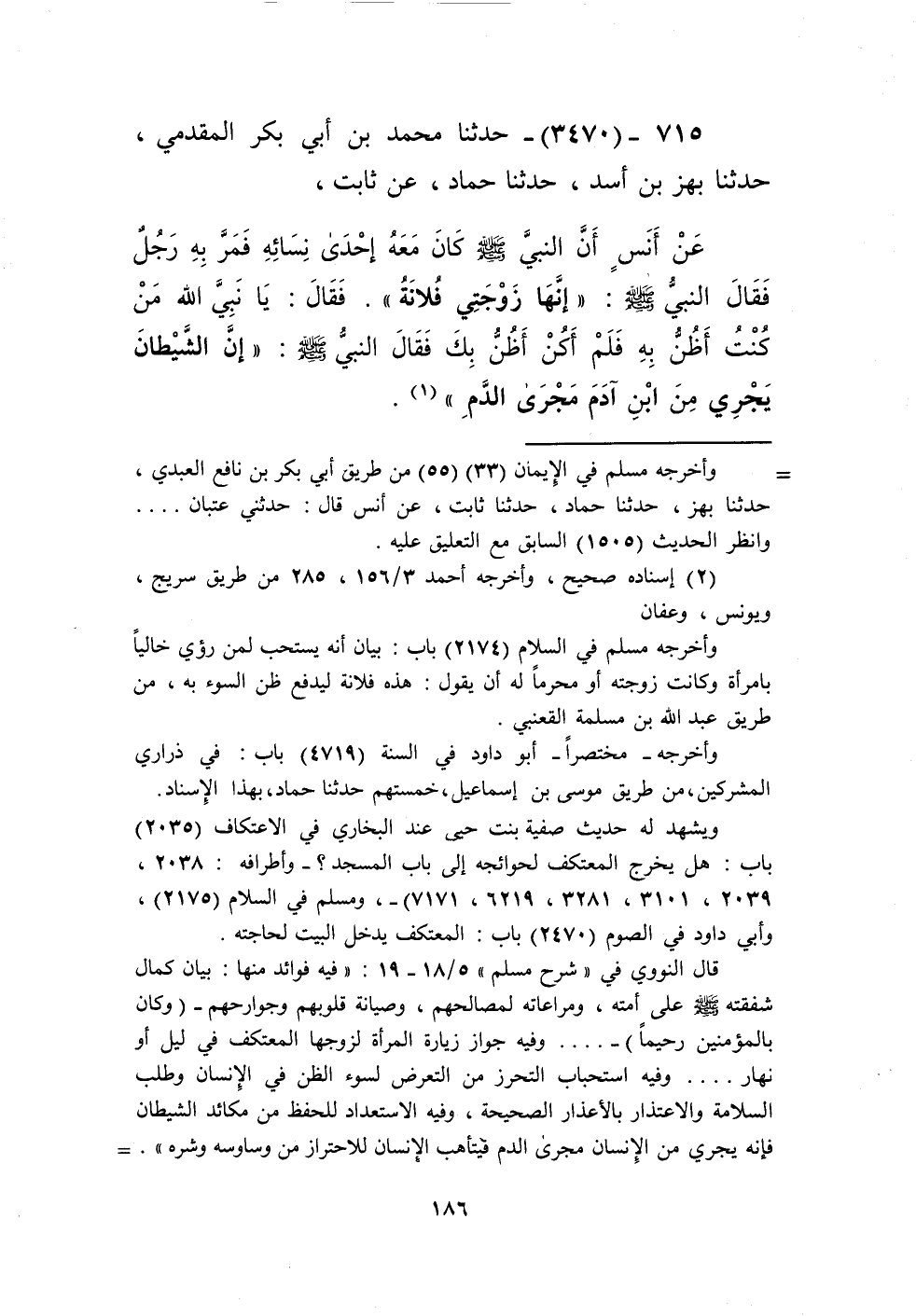 3470 - حَدَّثَنَا مُحَمَّدُ بْنُ أَبِي بَكْرٍ الْمُقَدَّمِيُّ، حَدَّثَنَا بَهْزُ بْنُ أَسَدٍ، حَدَّثَنَا حَمَّادٌ، عَنْ ثَابِتٍ، عَنْ أَنَسٍ، أَنَّ النَّبِيَّ صَلَّى اللهُ عَلَيْهِ وَسَلَّمَ كَانَ مَعَهُ إِحْدَى نِسَائِهِ فَمَرَّ بِهِ رَجُلٌ فَقَالَ النَّبِيُّ صَلَّى اللهُ عَلَيْهِ وَسَلَّمَ: «إِنَّهَا زَوْجَتَيَّ فُلَانَةٌ». فَقَالَ: يَا نَبِيَّ اللَّهِ، مَنْ كُنْتُ أَظُنُّ بِهِ فَلَمْ أَكُنْ أَظُنُّ بِكَ. فَقَالَ النَّبِيُّ صَلَّى اللهُ عَلَيْهِ وَسَلَّمَ: «إِنَّ §الشَّيْطَانَ يَجْرِي مِنَ ابْنِ آدَمَ مَجْرَى الدَّمِ» Kإسناده صحيح