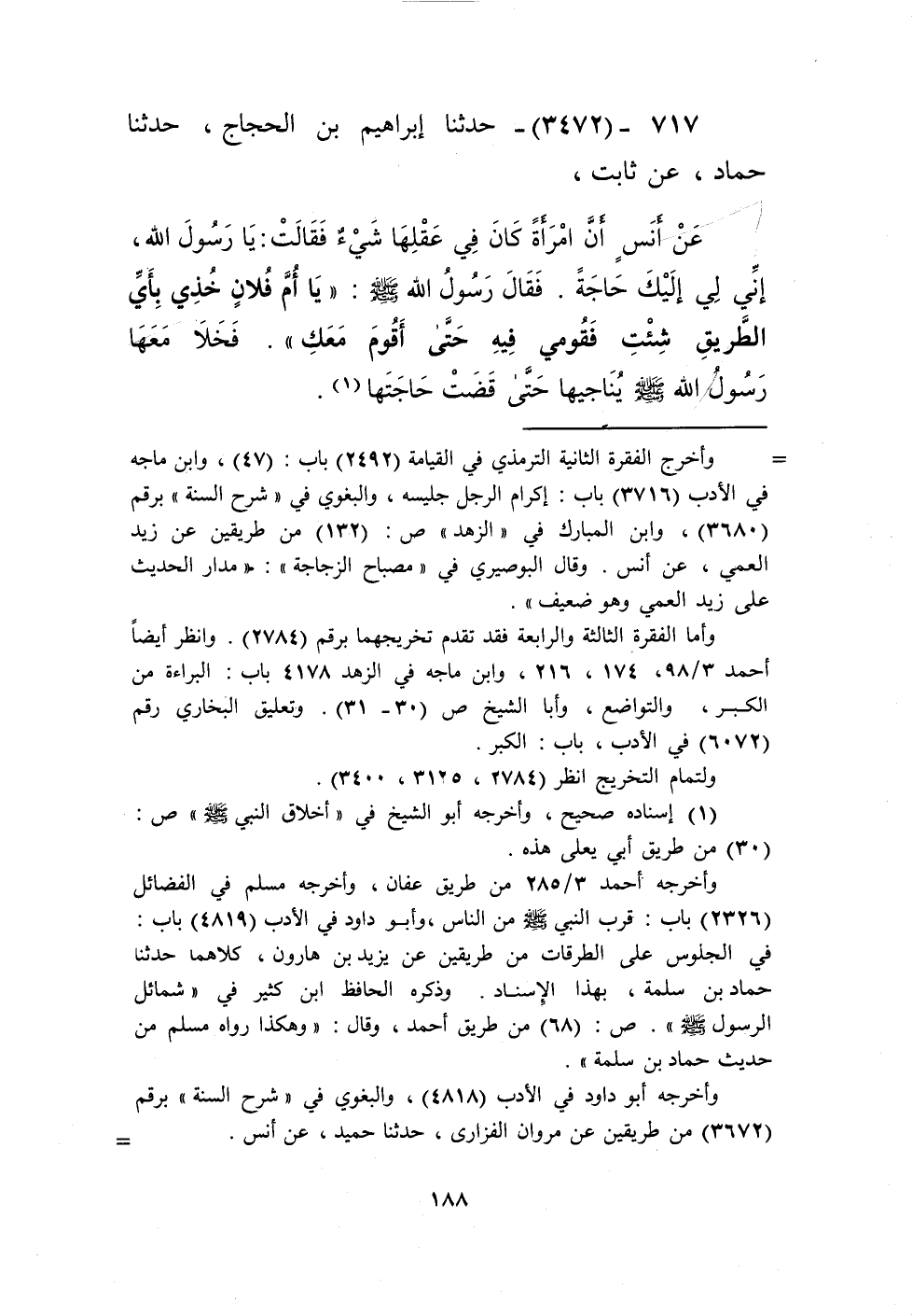 3472 - حَدَّثَنَا إِبْرَاهِيمُ بْنُ الْحَجَّاجِ، حَدَّثَنَا حَمَّادٌ، عَنْ ثَابِتٍ، عَنْ أَنَسٍ، أَنَّ امْرَأَةً كَانَ فِي عَقْلِهَا شَيْءٌ، فَقَالَتْ: يَا رَسُولَ اللَّهِ، إِنِّي لِي إِلَيْكَ حَاجَةٌ. فَقَالَ رَسُولُ اللَّهِ صَلَّى اللهُ عَلَيْهِ وَسَلَّمَ: «§يَا أُمَّ فُلَانٍ، خُذِي بِأَيِّ الطَّرِيقِ شِئْتِ، فَقُومي فِيهِ حَتَّى أَقُومَ مَعَكِ». فَخَلَا مَعَهَا رَسُولُ اللَّهِ صَلَّى اللهُ عَلَيْهِ وَسَلَّمَ يُنَاجِيهَا حَتَّى قَضَتْ حَاجَتَهَاKإسناده صحيح