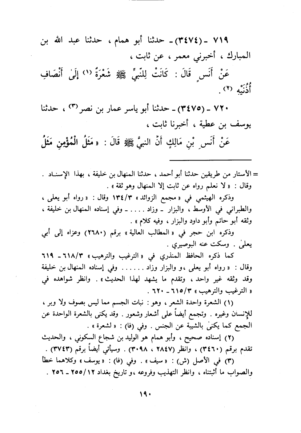 3474 - حَدَّثَنَا أَبُو هَمَّامٍ، حَدَّثَنَا عَبْدُ اللَّهِ بْنُ الْمُبَارَكِ، أَخْبَرَنِي مَعْمَرٌ، عَنْ ثَابِتٍ، عَنْ أَنَسٍ، قَالَ: كَانَتْ لِلنَّبِيِّ صَلَّى اللهُ عَلَيْهِ وَسَلَّمَ «§شَعَرَةٌ إِلَى أَنْصَافِ أُذُنَيْهِ» Kإسناده صحيح