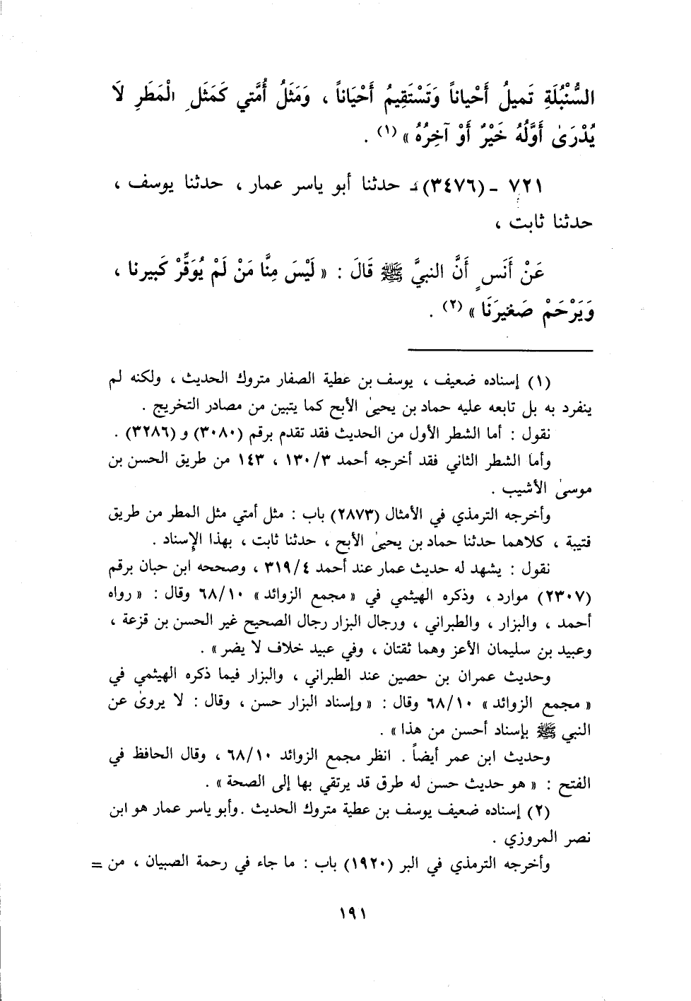 3476 - حَدَّثَنَا أَبُو يَاسِرٍ عَمَّارُ، حَدَّثَنَا يُوسُفُ، حَدَّثَنَا ثَابِتٌ، عَنْ أَنَسٍ، أَنَّ النَّبِيَّ صَلَّى اللهُ عَلَيْهِ وَسَلَّمَ قَالَ: «§لَيْسَ مِنَّا مَنْ لَمْ يُوَقِّرْ كَبِيرَنَا، وَيَرْحَمْ صَغِيرَنَا» Kإسناده ضعيف