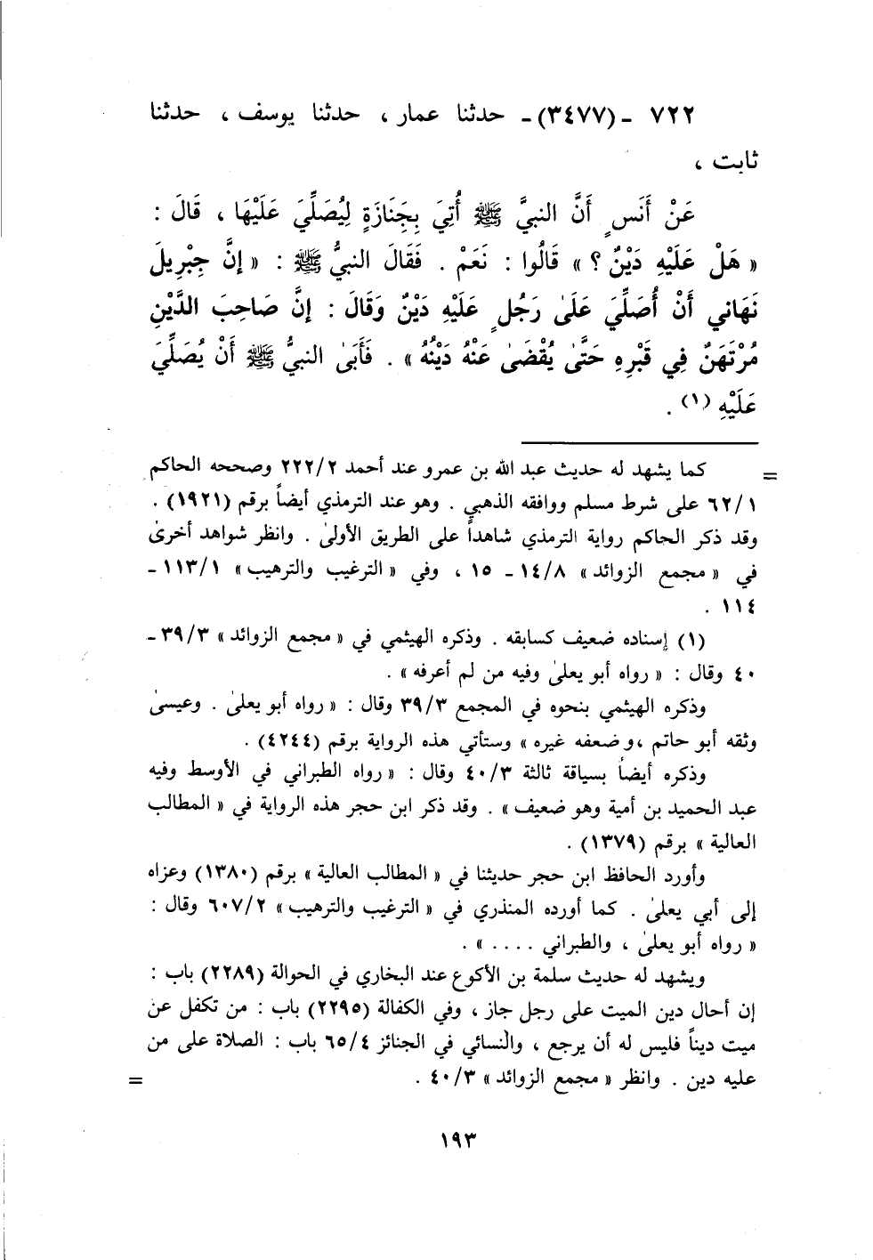 3477 - حَدَّثَنَا عَمَّارٌ، حَدَّثَنَا يُوسُفُ، حَدَّثَنَا ثَابِتٌ، عَنْ أَنَسٍ، أَنَّ النَّبِيَّ صَلَّى اللهُ عَلَيْهِ وَسَلَّمَ أُتِيَ بِجَنَازَةٍ لَيُصَلِّيَ عَلَيْهَا، قَالَ: «§هَلْ عَلَيْهِ دَيْنٌ؟» قَالُوا: نَعَمْ. فَقَالَ النَّبِيُّ صَلَّى اللهُ عَلَيْهِ وَسَلَّمَ: " إِنَّ جِبْرِيلَ نَهَانِي أَنْ أُصَلِّيَ عَلَى رَجُلٍ عَلَيْهِ دَيْنٌ، وَقَالَ: إِنَّ صَاحِبَ الدَّيْنِ مُرْتَهَنٌ فِي قَبْرِهِ، حَتَّى يُقْضَى عَنْهُ دَيْنُهُ " فَأَبَى النَّبِيُّ صَلَّى اللهُ عَلَيْهِ وَسَلَّمَ أَنْ يُصَلِّيَ عَلَيْهِKإسناده ضعيف