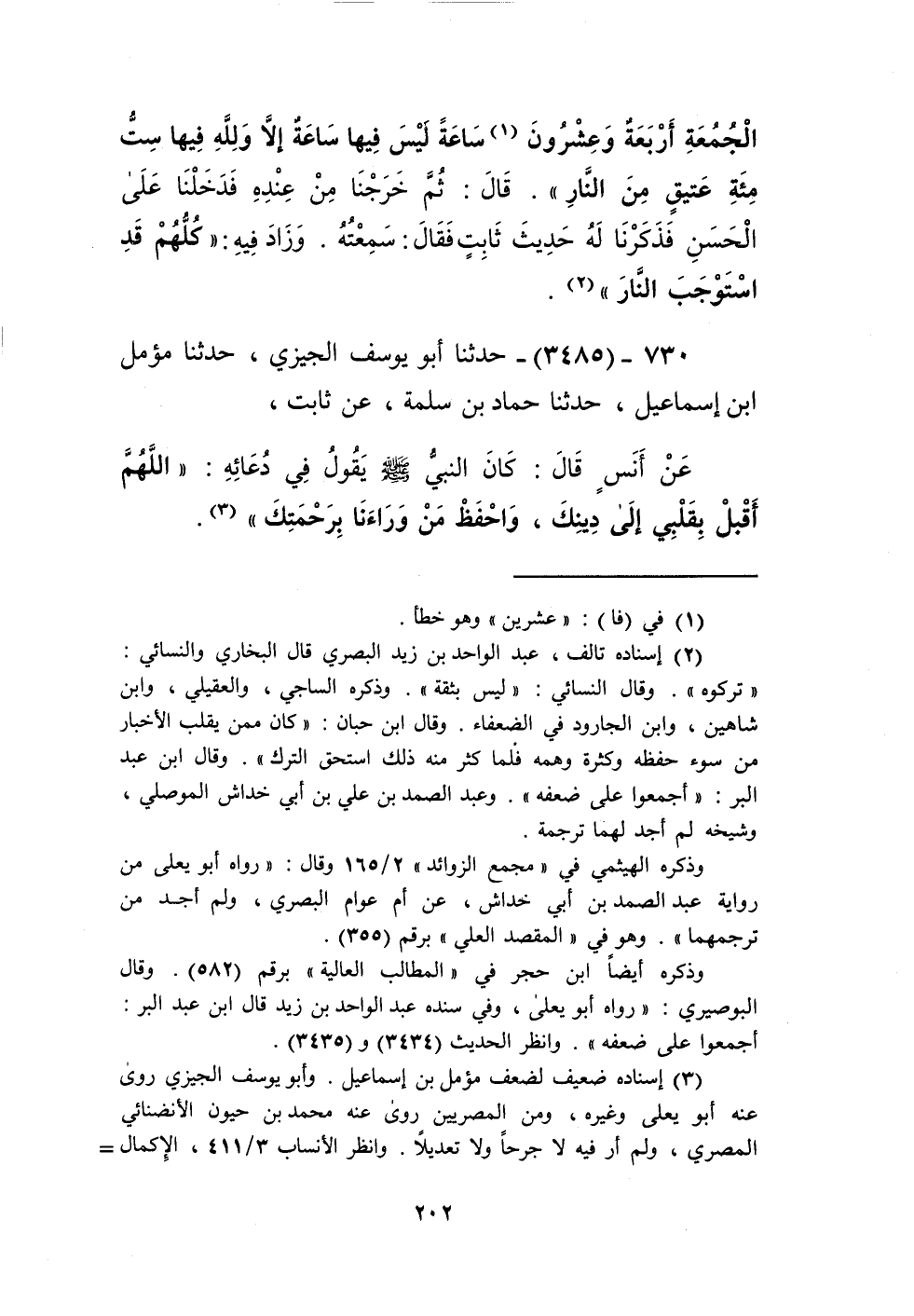 3485 - حَدَّثَنَا أَبُو يُوسُفَ الْجِيزِيُّ، حَدَّثَنَا مُؤَمَّلُ بْنُ إِسْمَاعِيلَ، حَدَّثَنَا حَمَّادُ بْنُ سَلَمَةَ، عَنْ ثَابِتٍ، عَنْ أَنَسٍ، قَالَ: كَانَ النَّبِيُّ صَلَّى اللهُ عَلَيْهِ وَسَلَّمَ يَقُولُ فِي دُعَائِهِ: «§اللَّهُمَّ أَقْبِلْ بِقَلْبِي إِلَى دِينِكَ، وَاحْفَظْ مَنْ وَرَاءَنَا بِرَحْمَتِكَ» Kإسناده ضعيف