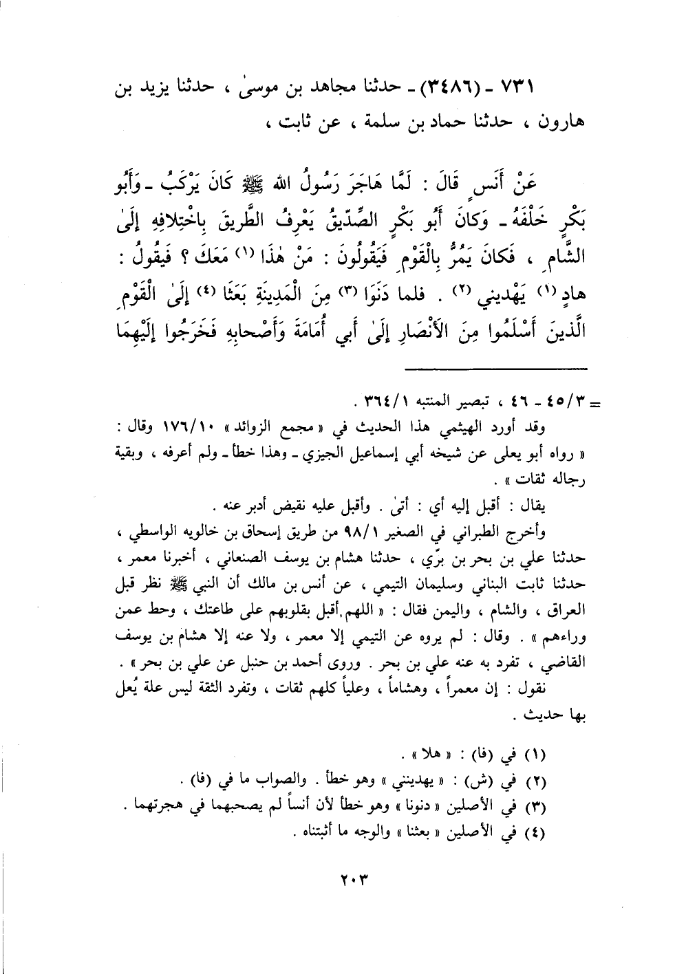 3486 - حَدَّثَنَا مُجَاهِدُ بْنُ مُوسَى، حَدَّثَنَا يَزِيدُ بْنُ هَارُونَ، حَدَّثَنَا حَمَّادُ بْنُ سَلَمَةَ، عَنْ ثَابِتٍ، عَنْ أَنَسٍ، قَالَ: لَمَّا هَاجَرَ رَسُولُ اللَّهِ صَلَّى اللهُ عَلَيْهِ وَسَلَّمَ كَانَ يَرْكَبُ - وَأَبُو بَكْرٍ خَلْفَهُ - وَكَانَ أَبُو بَكْرٍ الصِّدِّيقُ يَعْرِفُ الطَّرِيقَ بِاخْتِلَافِهِ إِلَى الشَّامِ، فَكَانَ يَمُرُّ بِالْقَوْمِ فَيَقُولُونَ: مَنْ هَذَا مَعَكَ؟ فَيَقُولُ: هَادٍ يَهْدِينِي. فَلَمَّا دَنَوْا مِنَ الْمَدِينَةِ بَعْثَا إِلَى الْقَوْمِ الَّذِينَ أَسْلَمُوا مِنَ الْأَنْصَارِ إِلَى أَبِي أُمَامَةَ وَأَصْحَابِهِ، فَخَرَجُوا إِلَيْهِمَا فَقَالُوا: ادْخُلَا آمِنَيْنِ مُطَاعَيْنِ، فَدَخَلَا، قَالَ أَنَسٌ: «§فَمَا رَأَيْتُ يَوْمًا قَطُّ أَنْوَرَ وَلَا أَحْسَنَ مِنْ يَوْمِ دَخَلَ فِيهِ رَسُولُ اللَّهِ صَلَّى اللهُ عَلَيْهِ وَسَلَّمَ وَأَبُوبَكْرٍ الْمَدِينَةَ» Kإسناده صحيح