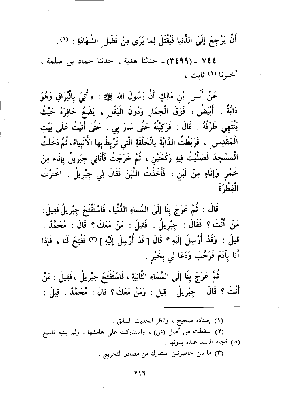 3499 - حَدَّثَنَا هُدْبَةُ، حَدَّثَنَا حَمَّادُ بْنُ سَلَمَةَ، أَخْبَرَنَا ثَابِتٌ، عَنْ أَنَسِ بْنِ مَالِكٍ، أَنَّ رَسُولَ اللَّهِ صَلَّى اللهُ عَلَيْهِ وَسَلَّمَ أُتِيَ بِالْبُرَاقِ وَهُوَ دَابَّةٌ، أَبْيَضُ، فَوْقَ الْحِمَارِ وَدُونَ الْبَغْلِ، يَضَعُ حَافِرَهُ حَيْثُ يَنْتَهِي طَرَفُهُ، قَالَ: " فَرَكِبْتُهُ حَتَّى سَارَ بِي، حَتَّى أَتَيْتُ عَلَى بَيْتِ الْمَقْدِسِ، فَرَبَطْتُ الدَّابَّةَ بِالْحَلْقَةِ الَّتِي تُرْبَطُ بِهَا الْأَنْبِيَاءُ، ثُمَّ دَخَلْتُ الْمَسْجِدَ فَصَلَّيْتُ فِيهِ رَكْعَتَيْنِ، ثُمَّ خَرَجْتُ فَأَتَانِي جِبْرِيلُ بِإِنَاءٍ مِنْ خَمْرٍ وَإِنَاءٍ مِنْ لَبَنٍ، فَأَخَذْتُ اللَّبَنَ، فَقَالَ لِي جِبْرِيلُ: اخْتَرْتَ الْفِطْرَةَ. قَالَ -[217]-: ثُمَّ عُرِجَ بِنَا إِلَى السَّمَاءِ الدُّنْيَا، فَاسْتَفْتَحَ جِبْرِيلُ فَقِيلَ: مَنْ أَنْتَ؟ فَقَالَ: جِبْرِيلُ. فَقِيلَ: مَنْ مَعَكَ؟ قَالَ: مُحَمَّدٌ. قِيلَ: وَقَدْ أُرْسِلَ إِلَيْهِ؟ قَالَ: قَدْ أُرْسِلَ إِلَيْهِ. فَفُتِحَ لَنَا، فَإِذَا أَنَا بِآدَمَ فَرَحَّبَ وَدَعَا لِي بِخَيْرٍ، ثُمَّ عُرِجَ بِنَا إِلَى السَّمَاءِ الثَّانِيَةِ، فَاسْتَفْتَحَ جِبْرِيلُ، فَقِيلَ: مَنْ أَنْتَ؟ قَالَ: جِبْرِيلُ. قِيلَ: وَمَنْ مَعَكَ؟ قَالَ: مُحَمَّدٌ -[218]-. قِيلَ: وَقَدْ أُرْسِلَ إِلَيْهِ؟ قَالَ: قَدْ أُرْسِلَ إِلَيْهِ. فَفُتِحَ لَنَا، فَإِذَا أَنَا بِابْنَيِ الْخَالَةِ، يَحْيَى وَعِيسَى، فَرَحَّبَا بِي، وَدَعَوْا لِي بِخَيْرٍ، ثُمَّ عُرِجَ بِنَا إِلَى السَّمَاءِ الثَّالِثَةِ، فَاسْتَفْتَحَ جِبْرِيلُ، فَقِيلَ: مَنْ أَنْتَ؟ قَالَ: جِبْرِيلُ. فَقِيلَ: وَمَنْ مَعَكَ؟ قَالَ: مُحَمَّدٌ. قِيلَ: أَوَ قَدْ أُرْسِلَ إِلَيْهِ؟ قَالَ: قَدْ أُرْسِلَ إِلَيْهِ. فَفُتِحَ لَنَا، فَإِذَا أَنَا بِيُوسُفَ، وَإِذَا هُوَ قَدْ أُعْطِيَ شَطْرَ الْحُسْنِ، فَرَحَّبَ وَدَعَا لِي بِخَيْرٍ، ثُمَّ عُرِجَ بِنَا إِلَى السَّمَاءِ الرَّابِعَةِ، فَاسْتَفْتَحَ جِبْرِيلُ فَقِيلَ: مَنْ أَنْتَ؟ قَالَ: جِبْرِيلُ. فَقِيلَ: وَمَنْ مَعَكَ؟ قَالَ: مُحَمَّدٌ. قِيلَ: وَقَدْ أُرْسِلَ إِلَيْهِ؟ قَالَ: قَدْ أُرْسِلَ إِلَيْهِ. فَفُتِحَ لَنَا، فَإِذَا أَنَا بِإِدْرِيسَ، فَرَحَّبَ وَدَعَا لِي بِخَيْرٍ، قَالَ: يَقُولُ اللَّهُ: {وَرَفَعْنَاهُ مَكَانًا عَلِيًّا} [مريم: 57]، ثُمَّ عُرِجَ بِنَا إِلَى السَّمَاءِ الْخَامِسَةِ، فَاسْتَفْتَحَ جِبْرِيلُ فَقِيلَ: مَنْ أَنْتَ؟ فَقَالَ: جِبْرِيلُ. فَقِيلَ: وَمَنْ مَعَكَ؟ قَالَ: مُحَمَّدٌ. قِيلَ: أَوَ قَدْ أُرْسِلَ إِلَيْهِ؟ قَالَ: قَدْ أُرْسِلَ إِلَيْهِ. فَفُتِحَ لَنَا فَإِذَا بِهَارُونَ، فَرَحَّبَ وَدَعَا لِي بِخَيْرٍ، ثُمَّ عُرِجَ بِنَا إِلَى السَّمَاءِ السَّادِسَةِ، فَاسْتَفْتَحَ جِبْرِيلُ فَقِيلَ: مَنْ أَنْتَ؟ قَالَ: جِبْرِيلُ. قِيلَ: وَمَنْ مَعَكَ؟ قَالَ: مُحَمَّدٌ. قِيلَ: قَدْ أُرْسِلَ إِلَيْهِ؟ قَالَ: قَدْ أُرْسِلَ إِلَيْهِ. فَفُتِحَ لَنَا، فَإِذَا أَنَا بِإِبْرَاهِيمَ، وَإِذَا هُوَ مُسْنِدٌ ظَهْرَهُ إِلَى الْبَيْتِ، فَيُدْخُلُهُ كُلَّ يَوْمٍ سَبْعُونَ أَلْفَ مَلَكٍ، ثُمَّ لَا يَعُودُونَ إِلَيْهِ، ثُمَّ ذَهَبَ بِي إِلَى السِّدْرَةِ الْمُنْتَهَى، فَإِذَا وَرَقُهَا كَآذَانِ الْفِيَلَةِ وَإِذَا ثَمَرُهَا كَالْقِلَالِ، فَلَمَّا غَشِيَهَا مِنْ أَمْرِ اللَّهِ مَا غَشِيَ تَغَيَّرَتْ، فَمَا أَحَدٌ مِنْ خَلْقِ اللَّهِ يُحْسِنُ يَصِفُهَا مِنْ حُسْنِهَا " قَالَ: «فَأُوحِيَ إِلَيَّ مَا أُوحِيَ، وَفُرِضَتْ عَلَيَّ فِي كُلِّ يَوْمٍ خَمْسُونَ صَلَاةً» قَالَ: " فَنَزَلَتُ إِلَى مُوسَى فَقَالَ: مَا فَرَضَ عَلَى أُمَّتِكَ؟ قَالَ: قُلْتُ: خَمْسِينَ صَلَاةً فِي كُلِّ يَوْمٍ وَلَيْلَةٍ. قَالَ: إِنَّ أُمَّتَكَ لَا تُطِيقُ ذَلِكَ، فَارْجِعْ إِلَى رَبِّكَ فَاسْأَلْ