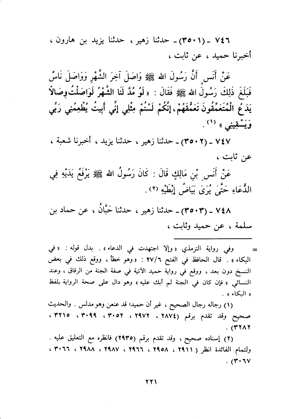 3501 - حَدَّثَنَا زُهَيْرٌ، حَدَّثَنَا يَزِيدُ بْنُ هَارُونَ، أَخْبَرَنَا حُمَيْدٌ، عَنْ ثَابِتٍ، عَنْ أَنَسٍ، أَنَّ رَسُولَ اللَّهِ صَلَّى اللهُ عَلَيْهِ وَسَلَّمَ وَاصَلَ آخِرَ الشَّهْرِ وَوَاصِلَ نَاسٌ، فَبَلَغَ ذَلِكَ رَسُولَ اللَّهِ صَلَّى اللهُ عَلَيْهِ وَسَلَّمَ فَقَالَ: «§لَوْ مُدَّ لَنَا الشَّهْرُ لَوَاصَلْتُ وِصَالًا يَدَعُ الْمُتَعَمِّقُونَ تَعَمُّقَهُمْ، إِنَّكُمْ لَسْتُمْ مِثْلِي، إِنِّي أَبِيتُ يُطْعِمُنِي رَبِّي وَيَسْقِينِي» Kرجاله رجال الصحيح والحديث صحيح