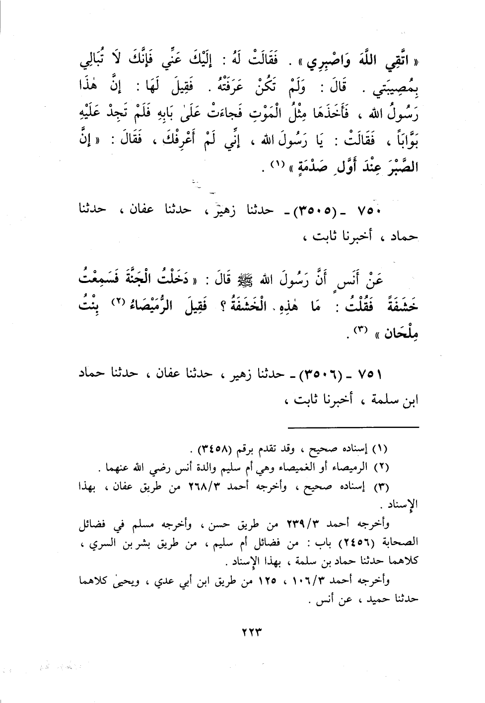 3505 - حَدَّثَنَا زُهَيْرٌ، حَدَّثَنَا عَفَّانُ، حَدَّثَنَا حَمَّادٌ، أَخْبَرَنَا ثَابِتٌ، عَنْ أَنَسٍ، أَنَّ رَسُولَ اللَّهِ صَلَّى اللهُ عَلَيْهِ وَسَلَّمَ قَالَ: " §دَخَلْتُ الْجَنَّةَ فَسَمِعَتُ خَشَفَةً، فَقُلْتُ: مَا هَذِهِ الْخَشَفَةَ؟ فَقِيلَ: الرُّمَيْصَاءُ بِنْتُ مِلْحَانَ "Kإسناده صحيح