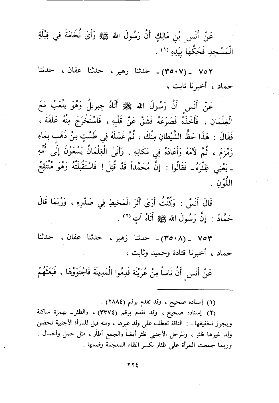 3507 - حَدَّثَنَا زُهَيْرٌ، حَدَّثَنَا عَفَّانُ، حَدَّثَنَا حَمَّادٌ، أَخْبَرَنَا ثَابِتٌ، عَنْ أَنَسٍ، أَنَّ رَسُولَ اللَّهِ صَلَّى اللهُ عَلَيْهِ وَسَلَّمَ " §أَتَاهُ جِبْرِيلُ وَهُوَ يَلْعَبُ مَعَ الْغِلْمَانِ، فَأَخَذَهُ فَصَرَعَهُ فَشَقَّ عَنْ قَلْبِهِ، فَاسْتَخْرَجَ مِنْهُ عَلَقَةً، فَقَالَ: هَذَا حَظُّ الشَّيْطَانِ مِنْكَ، ثُمَّ غَسَلَهُ فِي طَسْتٍ مِنْ ذَهَبٍ بِمَاءِ زَمْزَمَ، ثُمَّ لَأَمَهُ وَأَعَادَهُ فِي مَكَانِهِ " وَأَتَى الْغِلْمَانُ يَسْعَوْنَ إِلَى أُمِّهِ - يَعْنِي: ظِئْرَهُ - فَقَالُوا: إِنَّ مُحَمَّدًا قَدْ قُتِلَ فَاسْتَقْبَلَتْهُ وَهُوَ مُنْتَقِعُ اللَّوْنِ، قَالَ أَنَسٌ: «وَكُنْتُ أَرَى أَثَرَ الْمِخْيَطِ فِي صَدْرِهِ» وَرُبَّمَا قَالَ حَمَّادٌ: «إِنَّ رَسُولَ اللَّهِ صَلَّى اللهُ عَلَيْهِ وَسَلَّمَ أَتَاهُ آتٍ» Kإسناده صحيح
