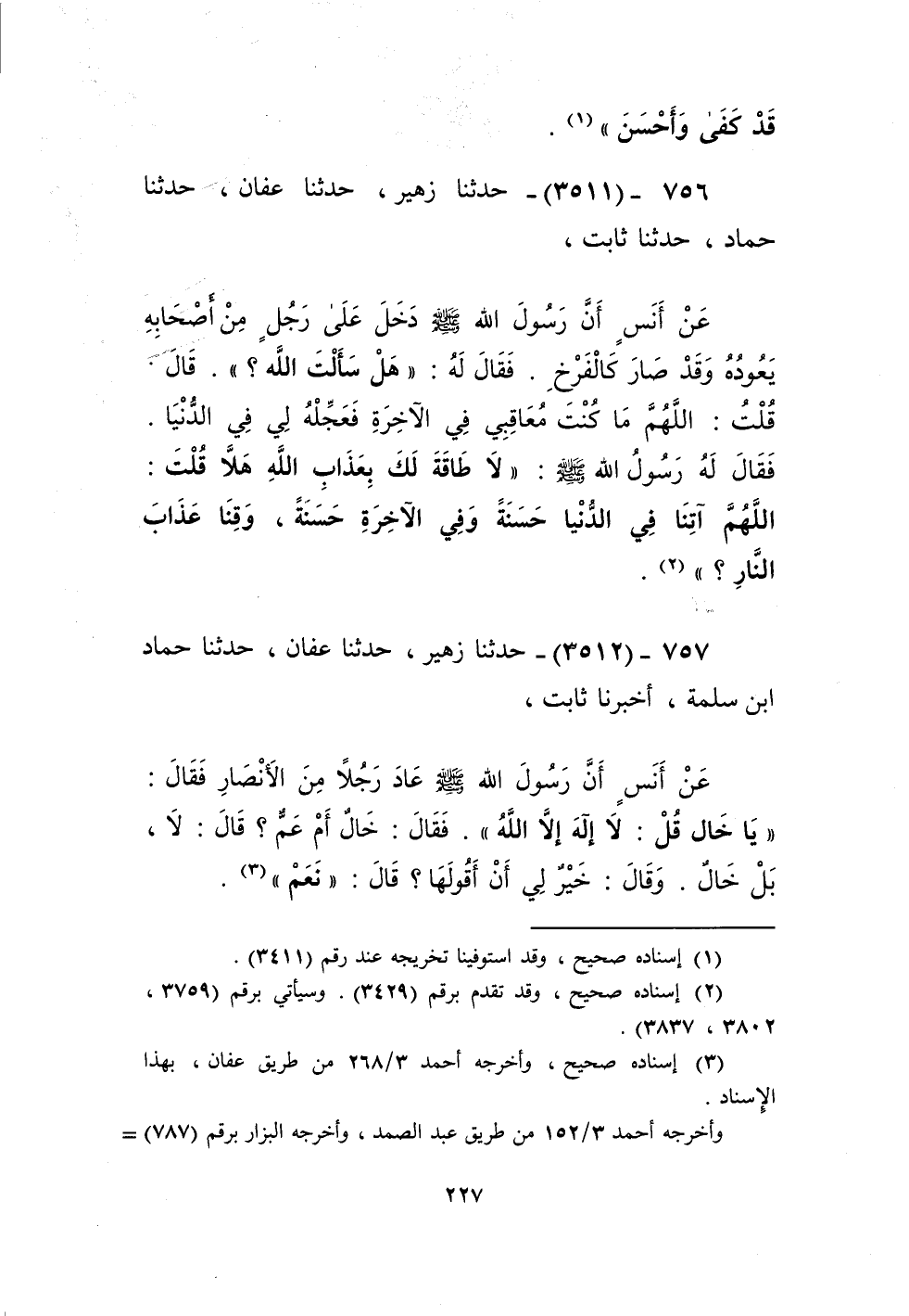 3511 - حَدَّثَنَا زُهَيْرٌ، حَدَّثَنَا عَفَّانُ، حَدَّثَنَا حَمَّادٌ، حَدَّثَنَا ثَابِتٌ، عَنْ أَنَسٍ، أَنَّ رَسُولَ اللَّهِ صَلَّى اللهُ عَلَيْهِ وَسَلَّمَ دَخَلَ عَلَى رَجُلٍ مِنْ أَصْحَابِهِ يَعُودُهُ وَقَدْ صَارَ كَالْفَرْخِ، فَقَالَ لَهُ: «§هَلْ سَأَلْتَ اللَّهَ؟» قَالَ: قُلْتُ: اللَّهُمَّ مَا كُنْتَ مُعَاقِبِي فِي الْآخِرَةِ فَعَجِّلْهُ لِي فِي الدُّنْيَا، فَقَالَ لَهُ رَسُولُ اللَّهِ صَلَّى اللهُ عَلَيْهِ وَسَلَّمَ: " لَا طَاقَةَ لَكَ بِعَذَابِ اللَّهِ، هَلَّا قُلْتَ: اللَّهُمَّ آتِنَا فِي الدُّنْيَا حَسَنَةً وَفِي الْآخِرَةِ حَسَنَةً وَقِنَا عَذَابَ النَّارِ "Kإسناده صحيح