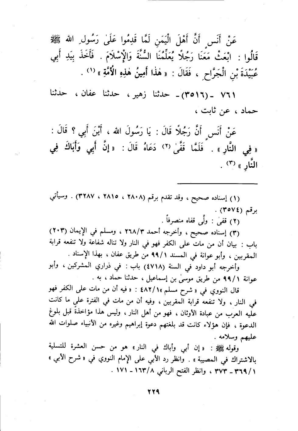 3516 - حَدَّثَنَا زُهَيْرٌ، حَدَّثَنَا عَفَّانُ، حَدَّثَنَا حَمَّادٌ، عَنْ ثَابِتٍ، عَنْ أَنَسٍ، أَنَّ رَجُلًا قَالَ: يَا رَسُولَ اللَّهِ، §أَيْنَ أَبِي؟ قَالَ: «فِي النَّارِ». فَلَمَّا قَفَّى دَعَاهُ قَالَ: «إِنَّ أَبِي وَأَبَاكَ فِي النَّارِ» Kإسناده صحيح
