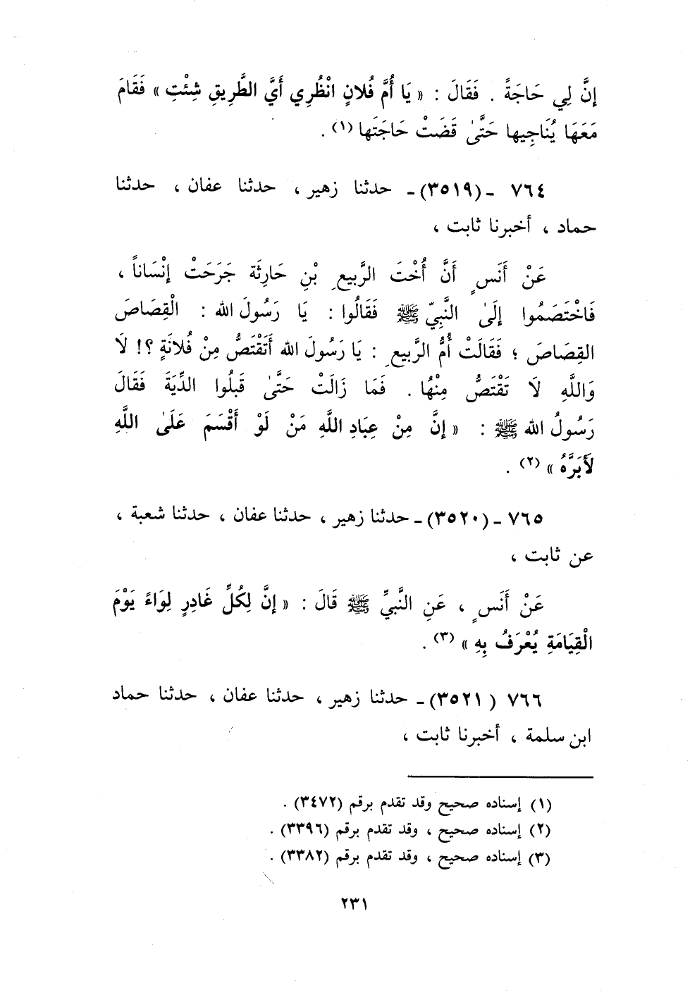 3519 - حَدَّثَنَا زُهَيْرٌ، حَدَّثَنَا عَفَّانُ، حَدَّثَنَا حَمَّادٌ، أَخْبَرَنَا ثَابِتٌ، عَنْ أَنَسٍ، أَنَّ أُخْتَ الرَّبِيعِ بْنِ حَارِثَةَ، جَرَحَتْ إِنْسَانًا، فَاخْتَصَمُوا إِلَى النَّبِيِّ صَلَّى اللهُ عَلَيْهِ وَسَلَّمَ فَقَالُوا: يَا رَسُولَ اللَّهِ، الْقِصَاصُ الْقِصَاصُ. فَقَالَتْ أُمُّ الرَّبِيعِ: يَا رَسُولَ اللَّهِ، أَتَقْتَصُّ مِنْ فُلَانَةٍ؟ لَا وَاللَّهِ لَا تَقْتَصُّ مِنْهَا. فَمَا زَالَتْ حَتَّى قَبِلُوا الدِّيَةَ، فَقَالَ رَسُولُ اللَّهِ صَلَّى اللهُ عَلَيْهِ وَسَلَّمَ: «§إِنَّ مِنْ عَبَّادِ اللَّهِ مَنْ لَوْ أَقْسَمَ عَلَى اللَّهِ لَأَبَرَّهُ» Kإسناده صحيح