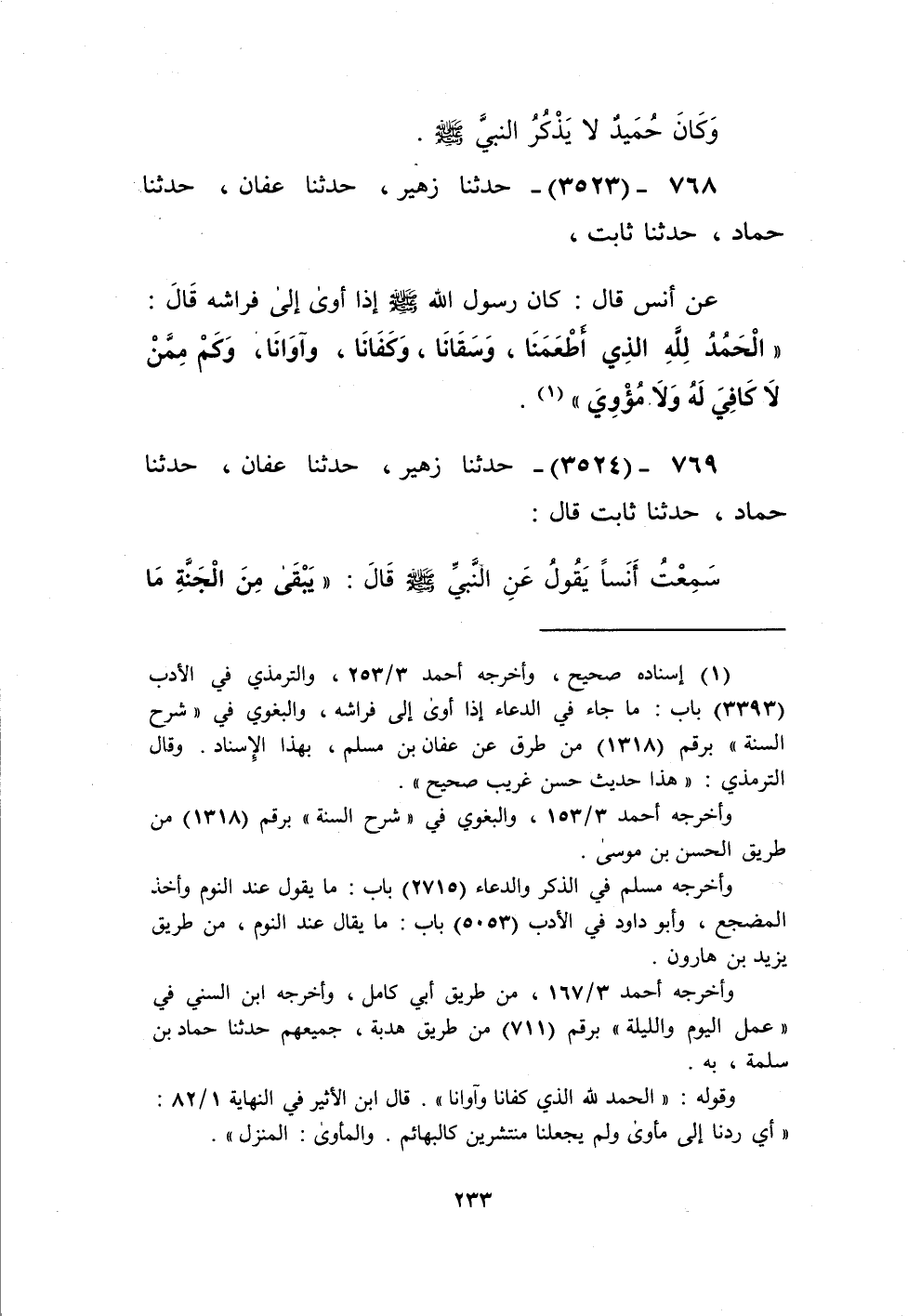 3523 - حَدَّثَنَا زُهَيْرٌ، حَدَّثَنَا عَفَّانُ، حَدَّثَنَا حَمَّادٌ، حَدَّثَنَا ثَابِتٌ، عَنْ أَنَسٍ، قَالَ: كَانَ رَسُولُ اللَّهِ صَلَّى اللهُ عَلَيْهِ وَسَلَّمَ §إِذَا أَوَى إِلَى فِرَاشِهِ قَالَ: «الْحَمْدُ لِلَّهِ الَّذِي أَطْعَمَنَا وَسَقَانَا وَكَفَانَا وَآوَانَا وَكَمْ مِمَّنْ لَا كَافِيَ لَهُ وَلَا مُؤْوِيَ» Kإسناده صحيح