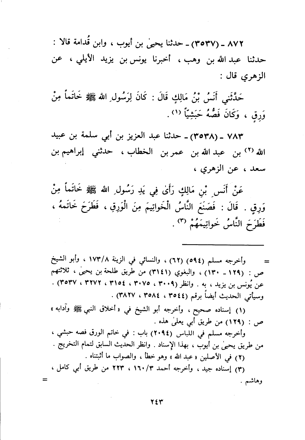 3537 - حَدَّثَنَا يَحْيَى بْنُ أَيُّوبَ، وَابْنُ قُدَامَةَ، قَالَا: حَدَّثَنَا عَبْدُ اللَّهِ بْنُ وَهْبٍ، أَخْبَرَنَا يُونُسُ بْنُ يَزِيدَ الْأَيْلِيُّ، عَنِ الزُّهْرِيِّ، قَالَ: حَدَّثَنِي أَنَسُ بْنُ مَالِكٍ، قَالَ: كَانَ لِرَسُولِ اللَّهِ صَلَّى اللهُ عَلَيْهِ وَسَلَّمَ «§خَاتَمًا مِنْ وَرِقٍ، وَكَانَ فَصُّهُ حَبَشِيًّا» Kإسناده صحيح