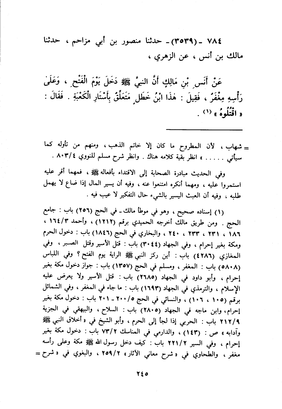 3539 - حَدَّثَنَا مَنْصُورُ بْنُ أَبِي مُزَاحِمٍ، حَدَّثَنَا مَالِكُ بْنُ أَنَسٍ، عَنِ الزُّهْرِيِّ، عَنْ أَنَسِ بْنِ مَالِكٍ، أَنَّ النَّبِيَّ صَلَّى اللهُ عَلَيْهِ وَسَلَّمَ دَخَلَ يَوْمَ الْفَتْحِ، وَعَلَى رَأْسِهِ مِغْفَرٌ، فَقِيلَ: هَذَا ابْنُ خَطَلٍ مُتَعَلِّقٌ بِأَسْتَارِ الْكَعْبَةِ. فَقَالَ: «§اقْتُلُوهُ» Kإسناده صحيح