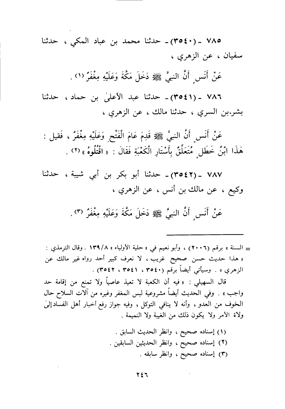 3540 - حَدَّثَنَا مُحَمَّدُ بْنُ عَبَّادٍ الْمَكِّيُّ، حَدَّثَنَا سُفْيَانُ، عَنِ الزُّهْرِيِّ، عَنْ أَنَسٍ، أَنَّ النَّبِيَّ صَلَّى اللهُ عَلَيْهِ وَسَلَّمَ «§دَخَلَ مَكَّةَ وَعَلَيْهِ مِغْفَرٌ» Kإسناده صحيح