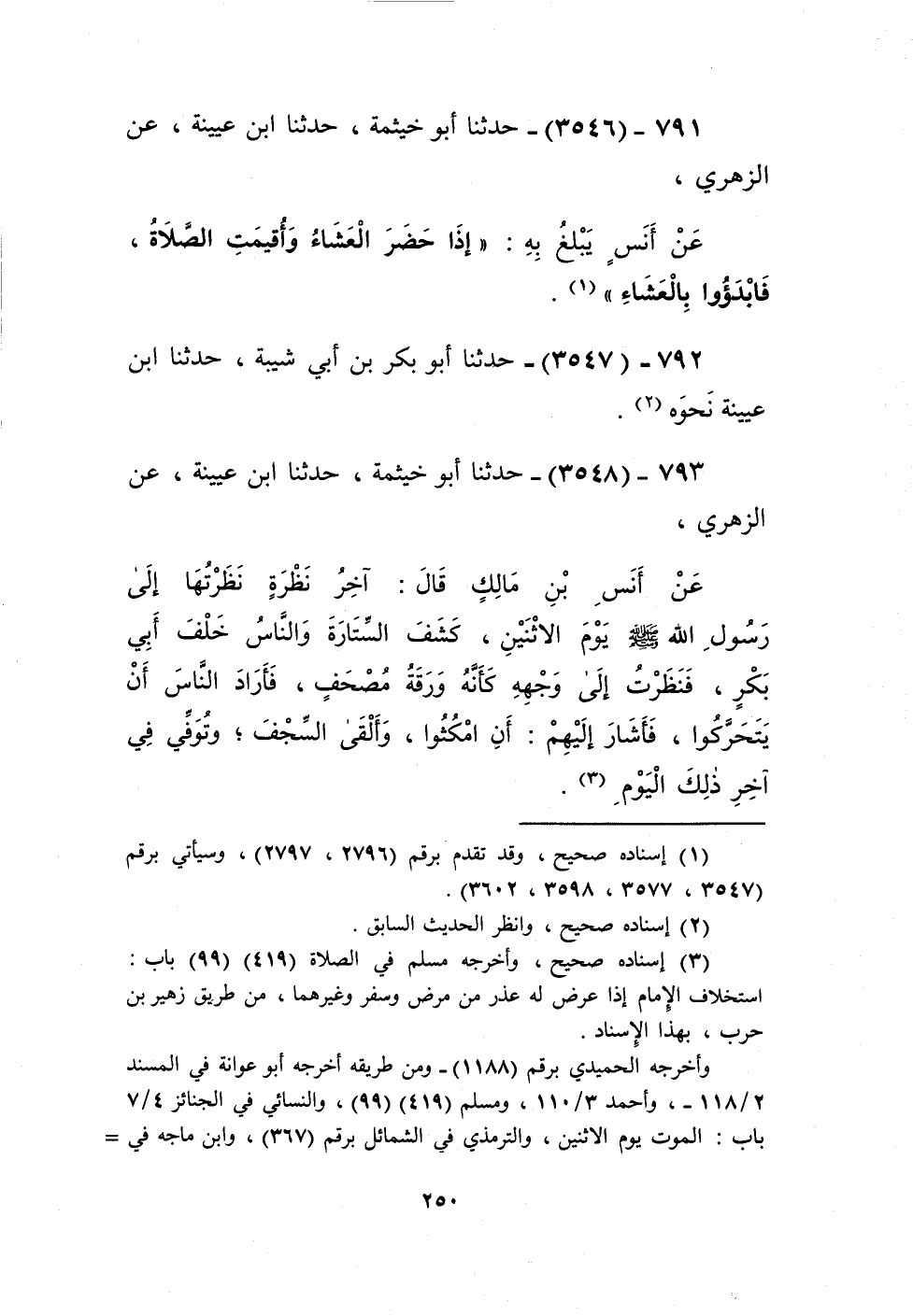 3548 - حَدَّثَنَا أَبُو خَيْثَمَةَ، حَدَّثَنَا ابْنُ عُيَيْنَةَ، عَنِ الزُّهْرِيِّ، عَنْ أَنَسِ بْنِ مَالِكٍ، قَالَ: " §آخِرُ نَظْرَةٍ نَظَرْتُهَا إِلَى رَسُولِ اللَّهِ صَلَّى اللهُ عَلَيْهِ وَسَلَّمَ يَوْمَ الَاثْنَيْنِ، كَشَفَ السِّتَارَةَ وَالنَّاسُ خَلْفَ أَبِي بَكْرٍ، فَنَظَرْتُ إِلَى وَجْهِهِ كَأَنَّهُ وَرَقَةُ مُصْحَفٍ، فَأَرَادَ النَّاسُ أَنْ يتَحَرَّكُوا، فَأَشَارَ إِلَيْهِمْ: أَنِ امْكُثُوا، وَأَلْقَى السِّجْفَ، وَتُوُفِّيَ فِي آخِرِ ذَلِكَ الْيَوْمِ "Kإسناده صحيح