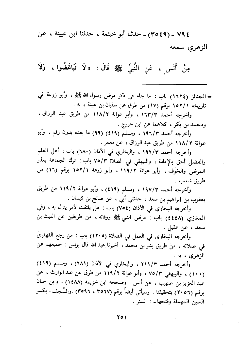 3549 - حَدَّثَنَا أَبُو خَيْثَمَةَ، حَدَّثَنَا ابْنُ عُيَيْنَةَ، عَنِ الزُّهْرِيِّ، سَمِعَهُ مِنْ أَنَسٍ، عَنِ النَّبِيِّ صَلَّى اللهُ عَلَيْهِ وَسَلَّمَ قَالَ: «§لَا تَبَاغَضُوا وَلَا تَحَاسَدُوا وَلَا تَدَابَرُوا وَلَا تَقَاطَعُوا وَكُونُوا عَبَّادَ اللَّهِ إِخْوَانًا، لَا يَحِلُّ لِمُسْلِمٍ أَنْ يَهْجُرَ أَخَاهُ فَوْقَ ثَلَاثٍ» Kإسناده صحيح