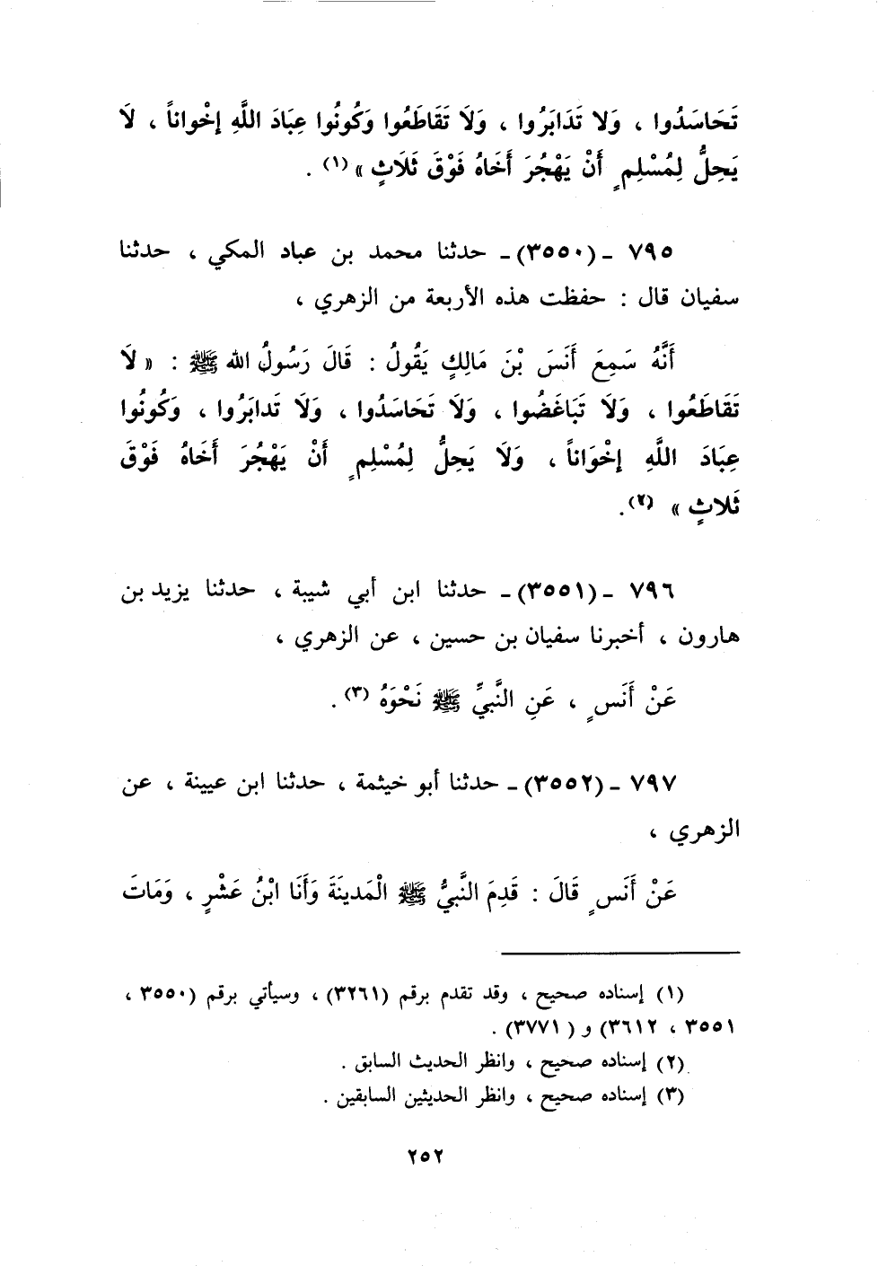 3550 - حَدَّثَنَا مُحَمَّدُ بْنُ عَبَّادٍ الْمَكِّيُّ، حَدَّثَنَا سُفْيَانُ، قَالَ: حَفِظْتُ هَذِهِ الْأَرْبَعَةَ مِنَ الزُّهْرِيِّ، أَنَّهُ سَمِعَ أَنَسَ بْنَ مَالِكٍ، يَقُولُ: قَالَ رَسُولُ اللَّهِ صَلَّى اللهُ عَلَيْهِ وَسَلَّمَ: «§لَا تَقَاطَعُوا وَلَا تَبَاغَضُوا وَلَا تَحَاسَدُوا وَلَا تَدَابَرُوا وَكُونُوا عَبَّادَ اللَّهِ إِخْوَانًا، وَلَا يَحِلُّ لِمُسْلِمٍ أَنْ يَهْجُرَ أَخَاهُ فَوْقَ ثَلَاثٍ» Kإسناده صحيح