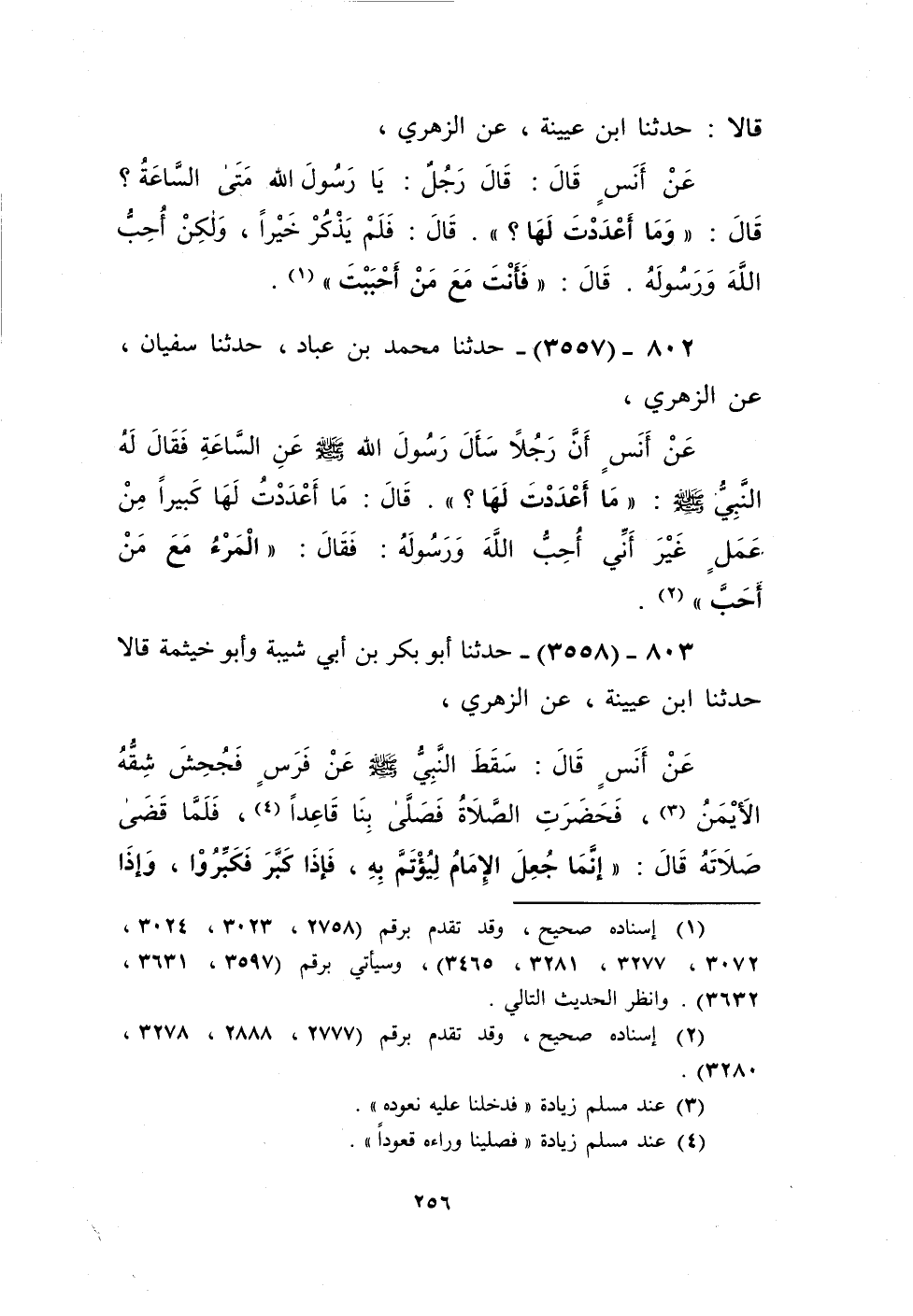 3557 - حَدَّثَنَا مُحَمَّدُ بْنُ عَبَّادٍ، حَدَّثَنَا سُفْيَانُ، عَنِ الزُّهْرِيِّ، عَنْ أَنَسٍ، أَنَّ رَجُلًا سَأَلَ رَسُولَ اللَّهِ صَلَّى اللهُ عَلَيْهِ وَسَلَّمَ عَنِ السَّاعَةِ، فَقَالَ لَهُ النَّبِيُّ صَلَّى اللهُ عَلَيْهِ وَسَلَّمَ: «مَا أَعْدَدْتَ لَهَا؟» قَالَ: مَا أَعْدَدْتُ لَهَا كَبِيرًا مِنْ عَمَلٍ غَيْرَ أَنِّي أُحِبُّ اللَّهَ وَرَسُولَهُ. فَقَالَ: «§الْمَرْءُ مَعَ مَنْ أَحَبَّ» Kإسناده صحيح