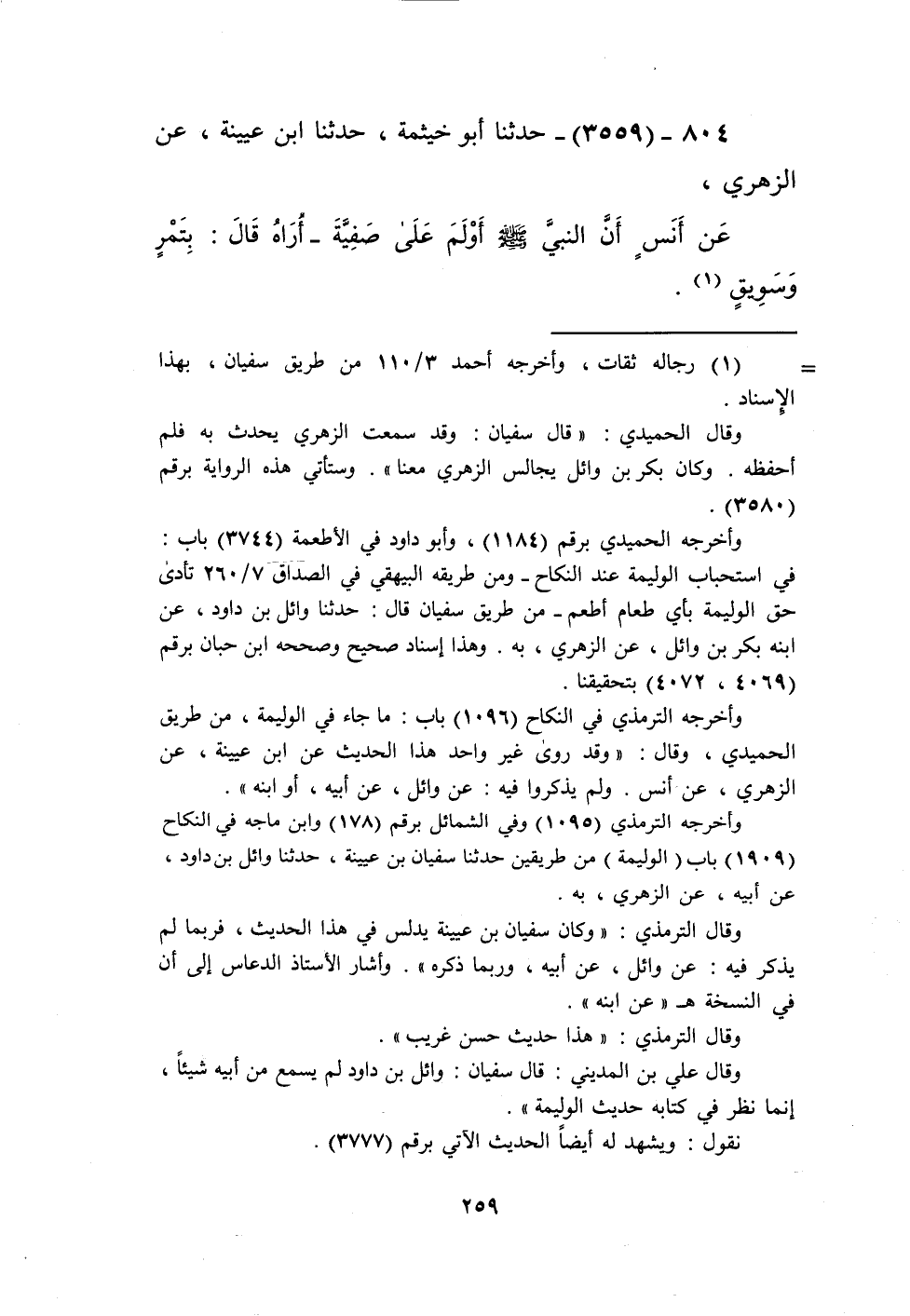 3559 - حَدَّثَنَا أَبُو خَيْثَمَةَ، حَدَّثَنَا ابْنُ عُيَيْنَةَ، عَنِ الزُّهْرِيِّ، عَنْ أَنَسٍ، أَنَّ النَّبِيَّ صَلَّى اللهُ عَلَيْهِ وَسَلَّمَ " §أَوْلَمَ عَلَى صَفِيَّةَ - أُرَاهُ قَالَ: - بِتَمْرٍ وَسَوِيقٍ "Kرجاله ثقات