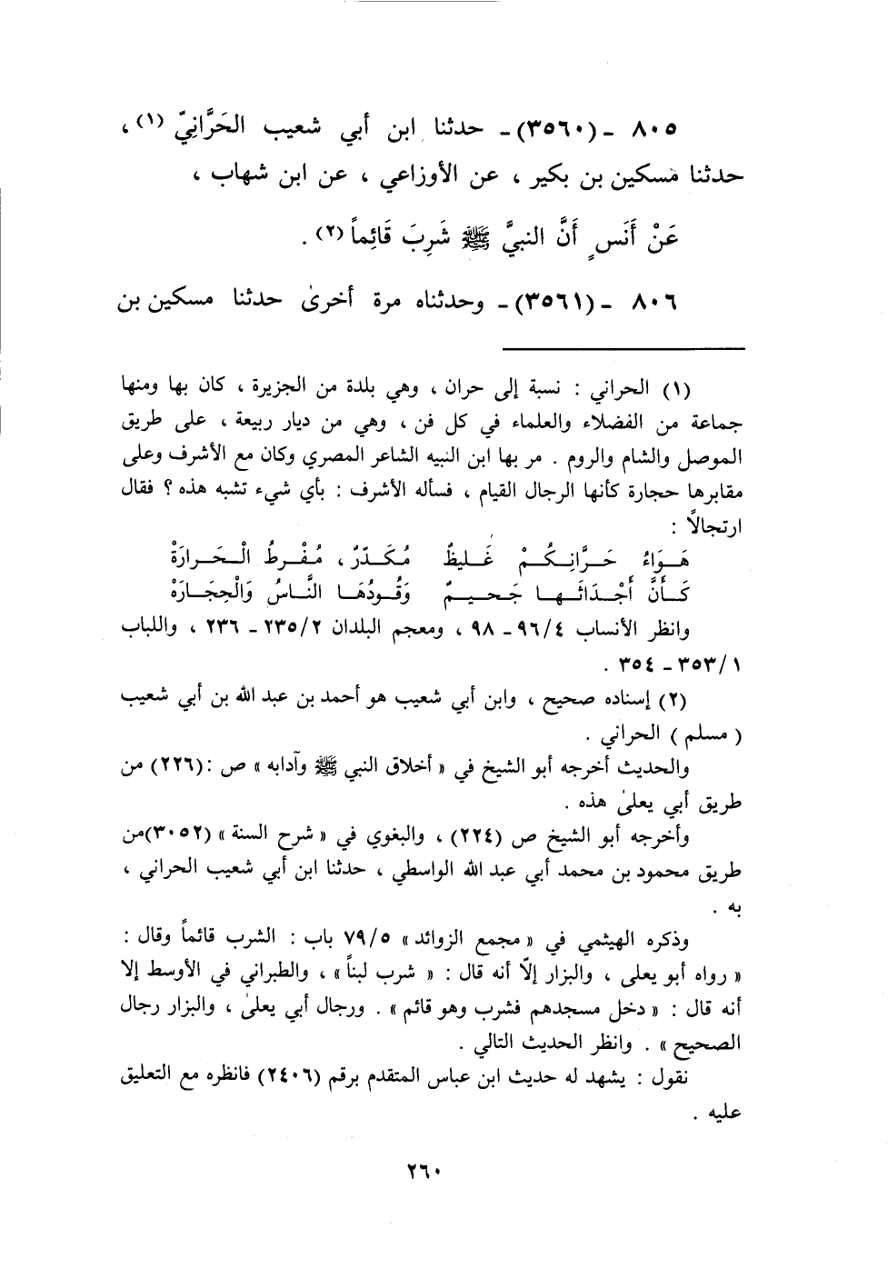 3560 - حَدَّثَنَا ابْنُ أَبِي شُعَيْبٍ الْحَرَّانِيُّ، حَدَّثَنَا مِسْكِينُ بْنُ بُكَيْرٍ، عَنِ الْأَوْزَاعِيِّ، عَنِ ابْنِ شِهَابٍ، عَنْ أَنَسٍ، أَنَّ النَّبِيَّ صَلَّى اللهُ عَلَيْهِ وَسَلَّمَ «§شَرِبَ قَائِمًا» Kإسناده صحيح