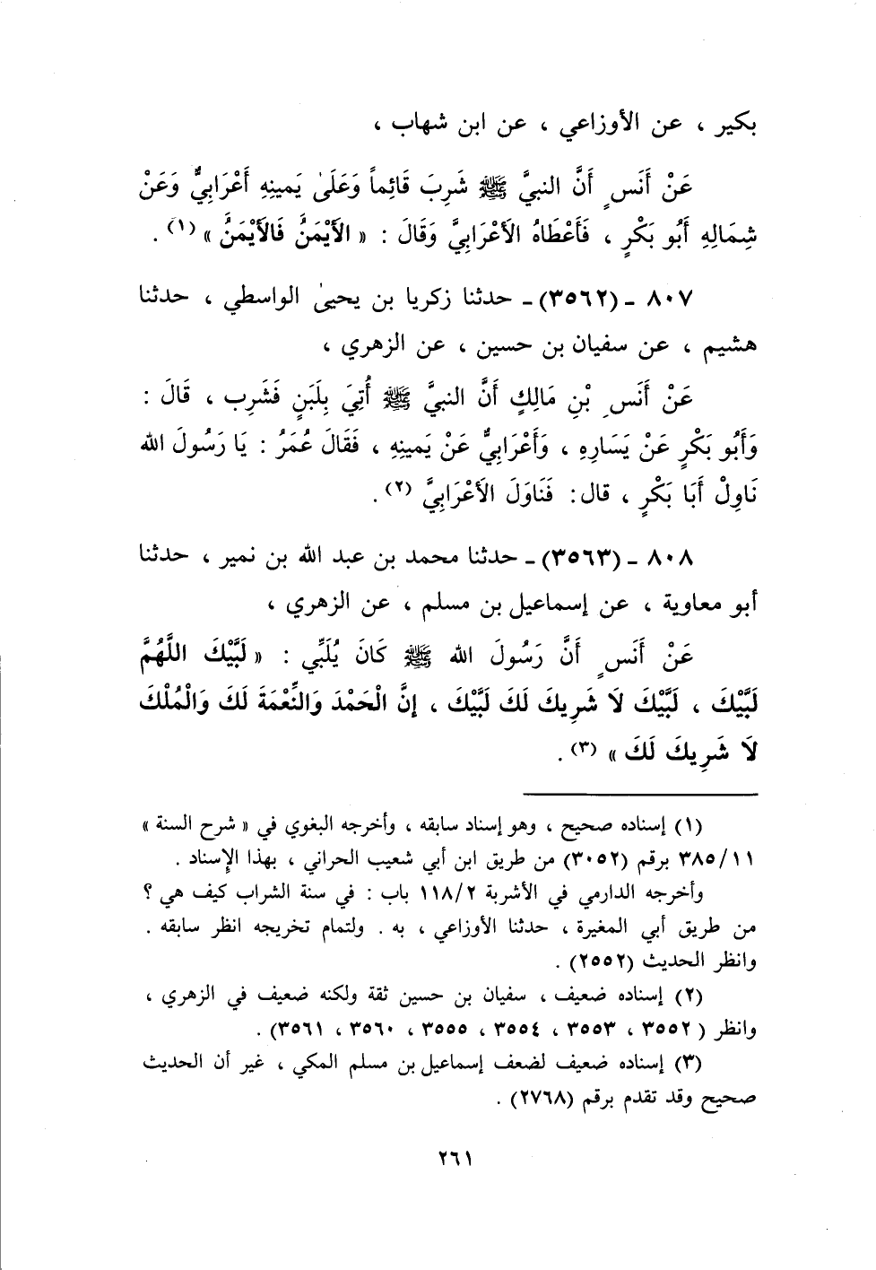 3563 - حَدَّثَنَا مُحَمَّدُ بْنُ عَبْدِ اللَّهِ بْنِ نُمَيْرٍ، حَدَّثَنَا أَبُو مُعَاوِيَةَ، عَنْ إِسْمَاعِيلَ بْنِ مُسْلِمٍ، عَنِ الزُّهْرِيِّ، عَنْ أَنَسٍ، أَنَّ رَسُولَ اللَّهِ صَلَّى اللهُ عَلَيْهِ وَسَلَّمَ كَانَ يُلَبِّي: «§لَبَّيْكَ اللَّهُمَّ لَبَّيْكَ، لَبَّيْكَ لَا شَرِيكَ لَكَ لَبَّيْكَ، إِنَّ الْحَمْدَ وَالنِّعْمَةَ لَكَ وَالْمُلْكَ، لَا شَرِيكَ لَكَ» Kإسناده ضعيف