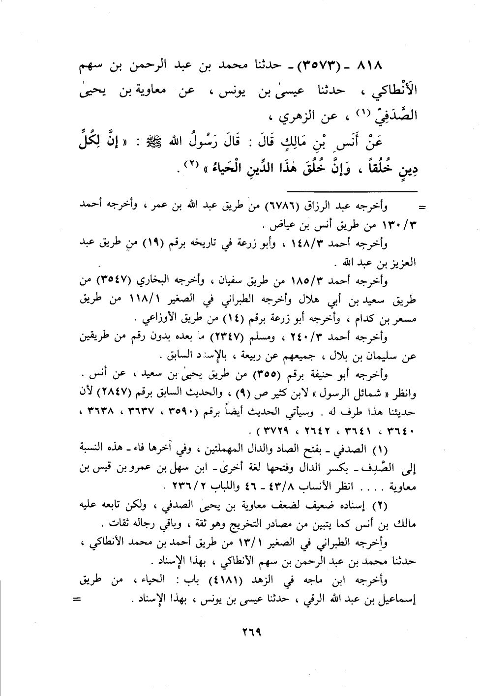 3573 - حَدَّثَنَا مُحَمَّدُ بْنُ عَبْدِ الرَّحْمَنِ بْنِ سَهْمٍ الْأَنْطَاكِيُّ، حَدَّثَنَا عِيسَى بْنُ يُونُسَ، عَنْ مُعَاوِيَةَ بْنِ يَحْيَى الصَّدَفِيِّ، عَنِ الزُّهْرِيِّ، عَنْ أَنَسِ بْنِ مَالِكٍ، قَالَ: قَالَ رَسُولُ اللَّهِ صَلَّى اللهُ عَلَيْهِ وَسَلَّمَ: «§إِنَّ لِكُلِّ دِينٍ خُلُقًا، وَإِنَّ خُلُقَ هَذَا الدِّينِ الْحَيَاءُ» Kإسناده ضعيف