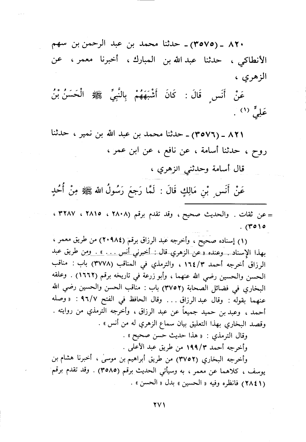 3575 - حَدَّثَنَا مُحَمَّدُ بْنُ عَبْدِ الرَّحْمَنِ بْنِ سَهْمٍ الْأَنْطَاكِيُّ، حَدَّثَنَا عَبْدُ اللَّهِ بْنُ الْمُبَارَكِ، أَخْبَرَنَا مَعْمَرٌ، عَنِ الزُّهْرِيِّ، عَنْ أَنَسٍ، قَالَ: §كَانَ أَشْبَهَهُمْ بِالنَّبِيِّ صَلَّى اللهُ عَلَيْهِ وَسَلَّمَ الْحَسَنُ بْنُ عَلِيٍّKإسناده صحيح