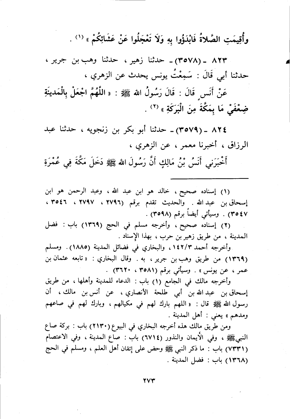 3578 - حَدَّثَنَا زُهَيْرٌ، حَدَّثَنَا وَهْبُ بْنُ جَرِيرٍ، حَدَّثَنَا أَبِي قَالَ: سَمِعْتُ يُونُسَ، يُحَدِّثُ، عَنِ الزُّهْرِيِّ، عَنْ أَنَسٍ، قَالَ: قَالَ رَسُولُ اللَّهِ صَلَّى اللهُ عَلَيْهِ وَسَلَّمَ: «§اللَّهُمَّ اجْعَلْ بِالْمَدِينَةِ ضِعْفَيْ مَا بِمَكَّةَ مِنَ الْبَرَكَةِ» Kإسناده صحيح
