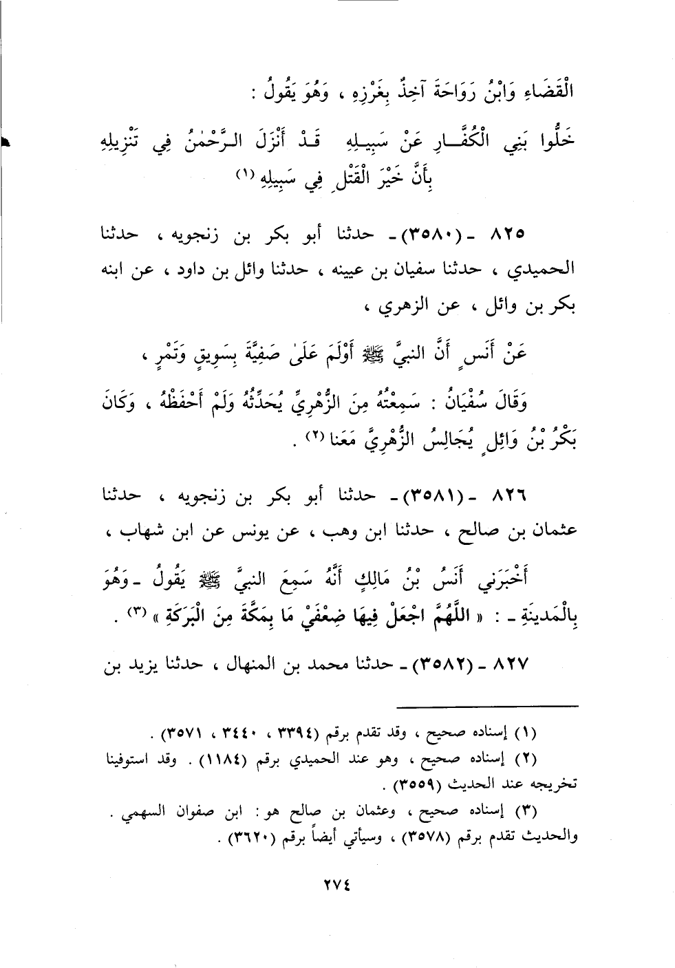 3581 - حَدَّثَنَا أَبُو بَكْرِ بْنِ زَنْجَوَيْهِ، حَدَّثَنَا عُثْمَانُ بْنُ صَالِحٍ، حَدَّثَنَا ابْنُ وَهْبٍ، عَنْ يُونُسَ، عَنِ ابْنِ شِهَابٍ، أَخْبَرَنِي أَنَسُ بْنُ مَالِكٍ، أَنَّهُ سَمِعَ النَّبِيَّ صَلَّى اللهُ عَلَيْهِ وَسَلَّمَ يَقُولُ وَهُوَ بِالْمَدِينَةِ: «§اللَّهُمَّ اجْعَلْ فِيهَا ضِعْفَيْ مَا بِمَكَّةَ مِنَ الْبَرَكَةِ» Kإسناده صحيح