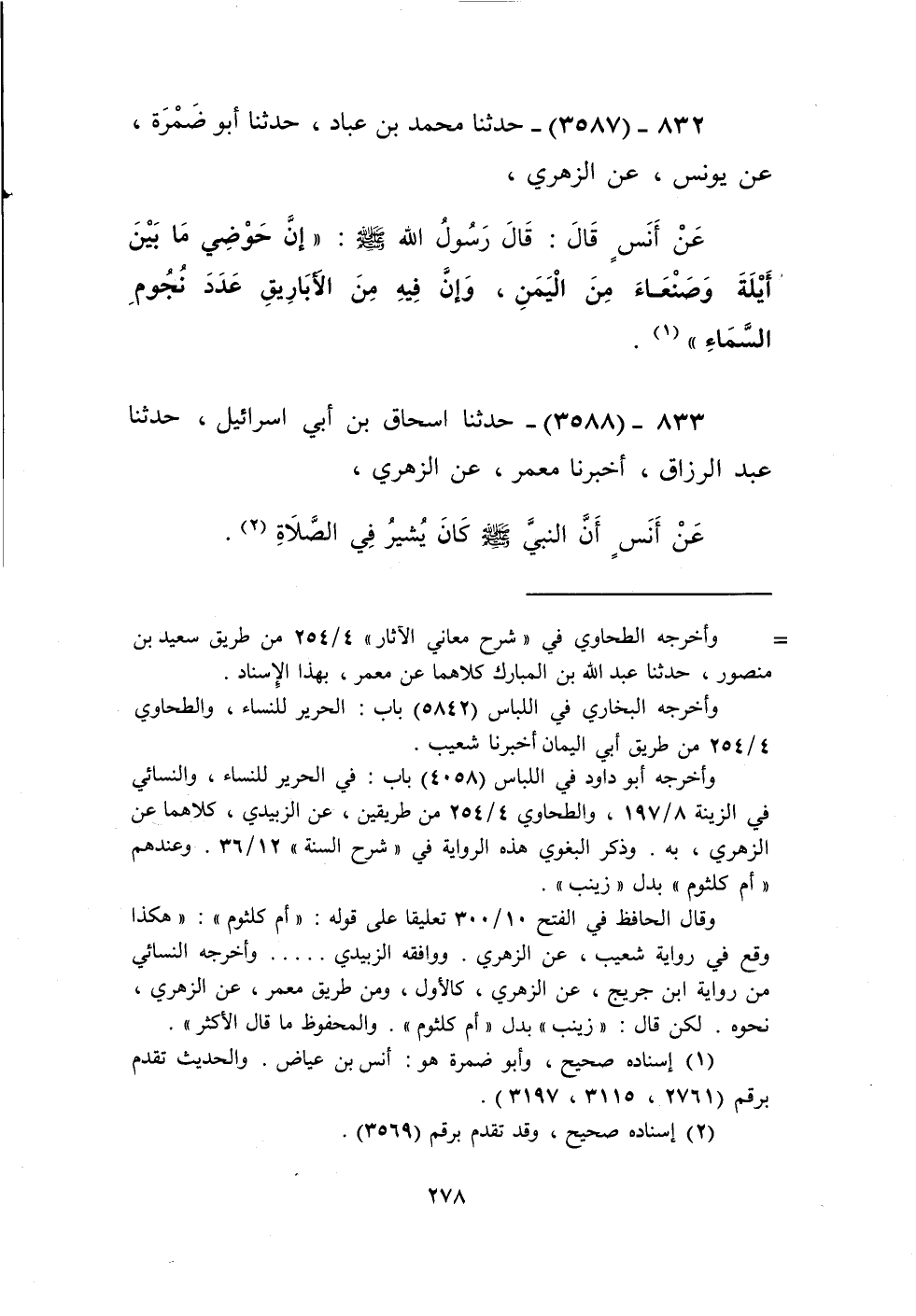 3588 - حَدَّثَنَا إِسْحَاقُ بْنُ أَبِي إِسْرَائِيلَ، حَدَّثَنَا عَبْدُ الرَّزَّاقِ، أَخْبَرَنَا مَعْمَرٌ، عَنِ الزُّهْرِيِّ، عَنْ أَنَسٍ، أَنَّ §النَّبِيَّ صَلَّى اللهُ عَلَيْهِ وَسَلَّمَ كَانَ يُشِيرُ فِي الصَّلَاةِKإسناده صحيح