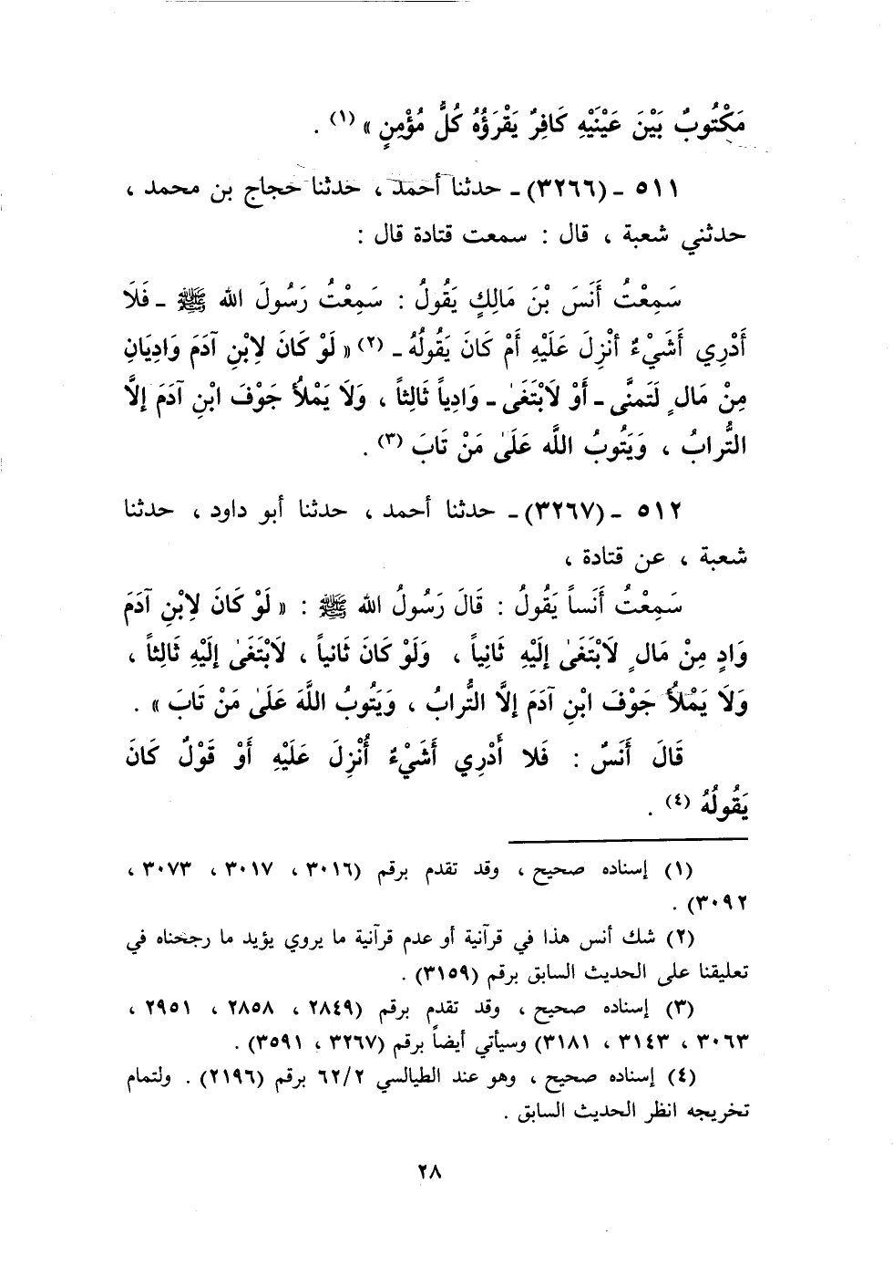 3266 - حَدَّثَنَا أَحْمَدُ، حَدَّثَنَا حَجَّاجُ بْنُ مُحَمَّدٍ، حَدَّثَنِي شُعْبَةُ، قَالَ: سَمِعْتُ قَتَادَةَ، قَالَ: سَمِعْتُ أَنَسَ بْنَ مَالِكٍ، يَقُولُ: سَمِعْتُ رَسُولَ اللَّهِ صَلَّى اللهُ عَلَيْهِ وَسَلَّمَ - فَلَا أَدْرِي أَشَيْءٌ أُنْزِلَ عَلَيْهِ أُمْ كَانَ يَقُولُهُ -: «§لَوْ كَانَ لِابْنِ آدَمَ وَادِيَانِ مِنْ مَالٍ لَتَمَنَّى أَوْ لَابْتَغَى وَادِيًا ثَالِثًا، وَلَا يَمْلَأُ جَوْفَ ابْنَ آدَمَ إِلَّا التُّرَابُ، وَيَتُوبُ اللَّهُ عَلَى مَنْ تَابَ» Kإسناده صحيح