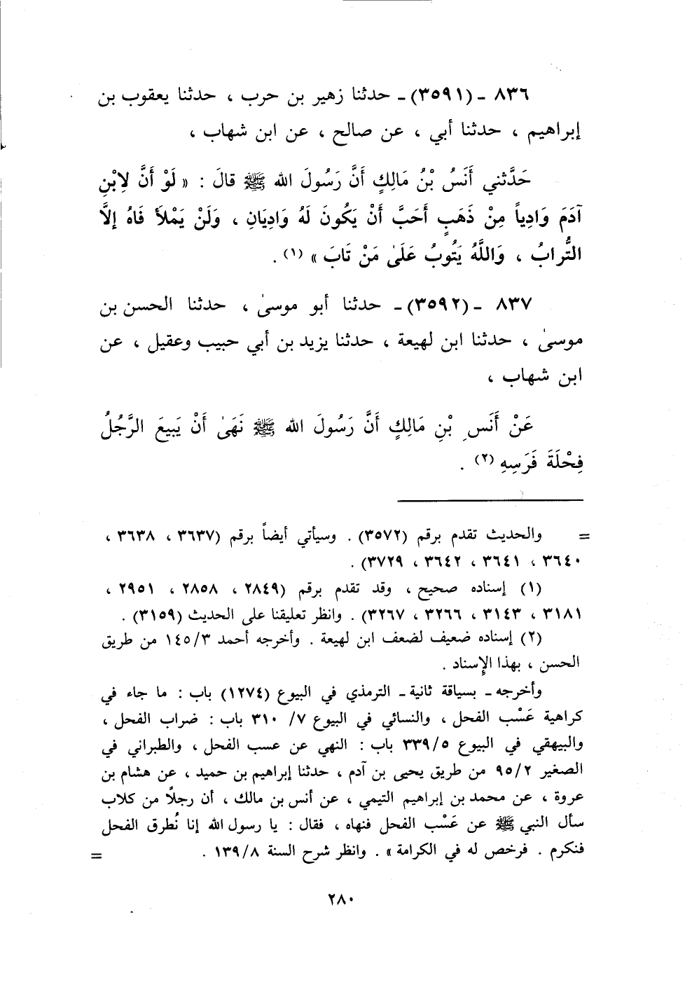 3591 - حَدَّثَنَا زُهَيْرُ بْنُ حَرْبٍ، حَدَّثَنَا يَعْقُوبُ بْنُ إِبْرَاهِيمَ، حَدَّثَنَا أَبِي، عَنْ صَالِحٍ، عَنِ ابْنِ شِهَابٍ، حَدَّثَنَا أَنَسُ بْنُ مَالِكٍ، أَنَّ رَسُولَ اللَّهِ صَلَّى اللهُ عَلَيْهِ وَسَلَّمَ قَالَ: «§لَوْ أَنَّ لِابْنِ آدَمَ وَادِيًا مِنْ ذَهَبٍ أَحَبَّ أَنْ يكُونَ لَهُ وَادِيَانِ، وَلَنْ يَمْلَأَ فَاهُ إِلَّا التُّرَابُ، وَاللَّهُ يَتُوبُ عَلَى مَنْ تَابَ»